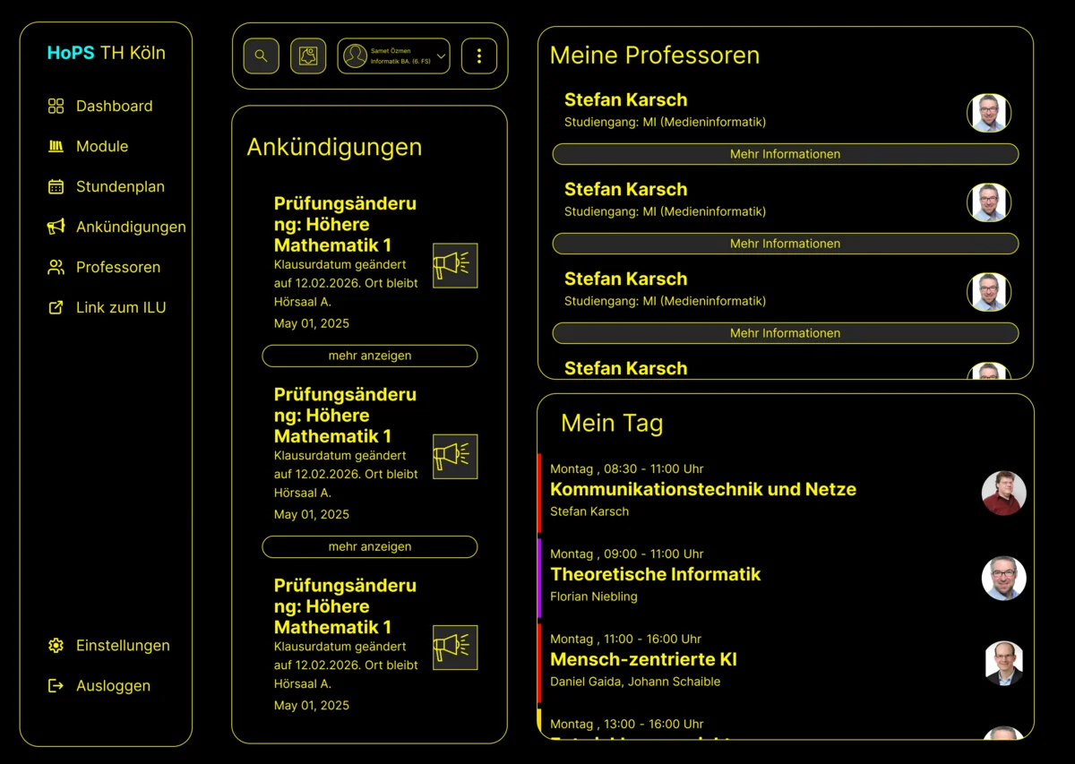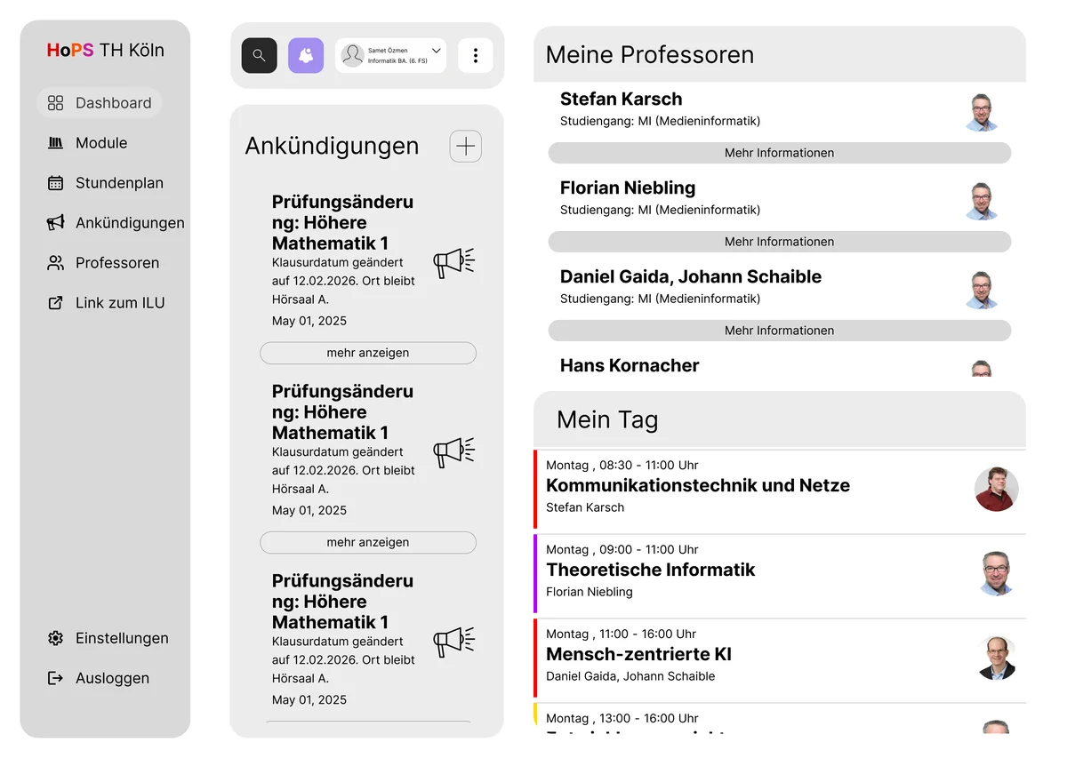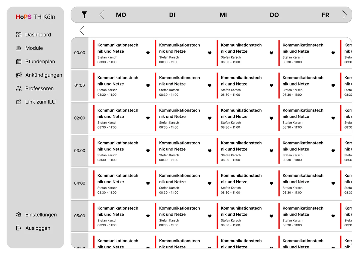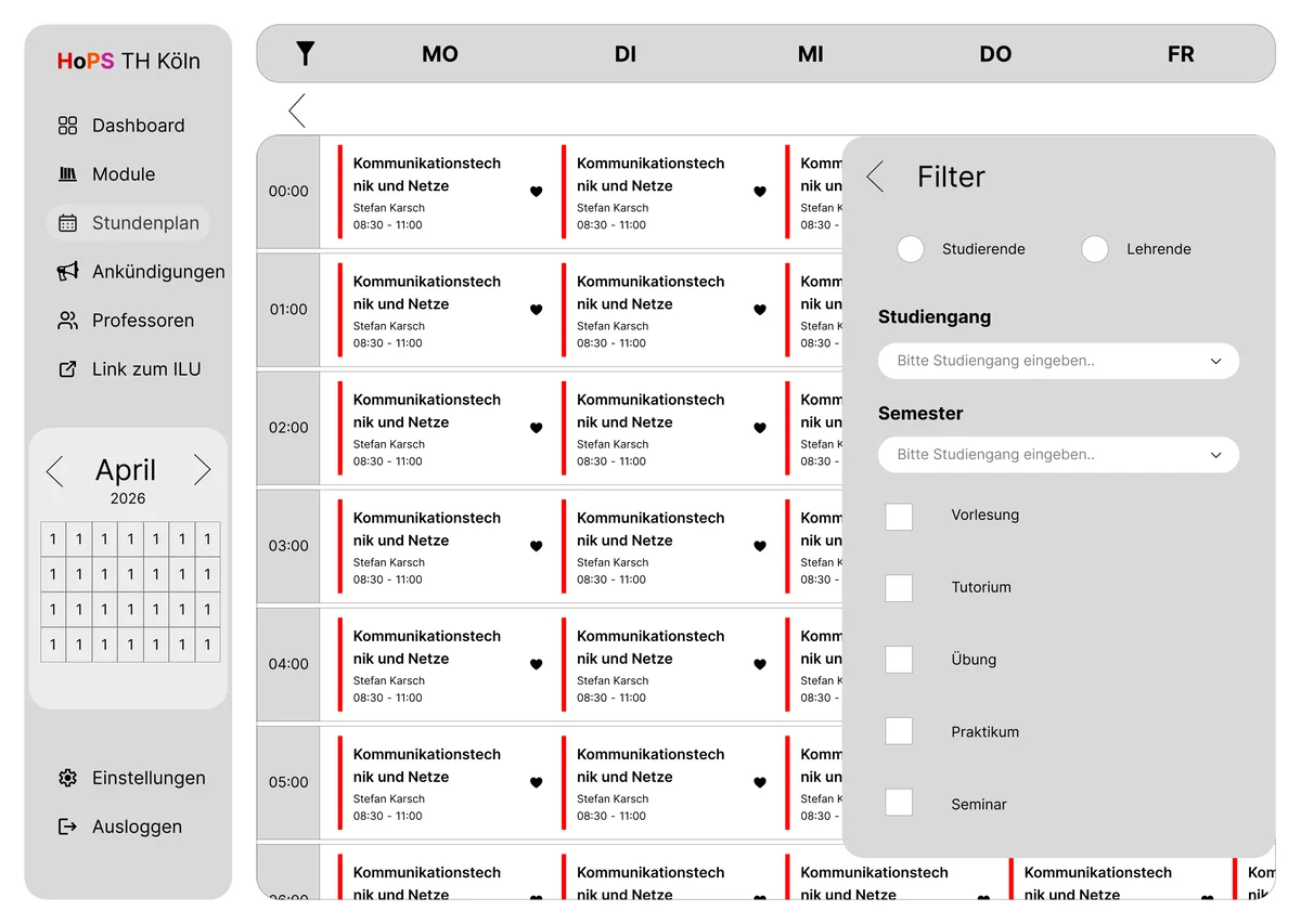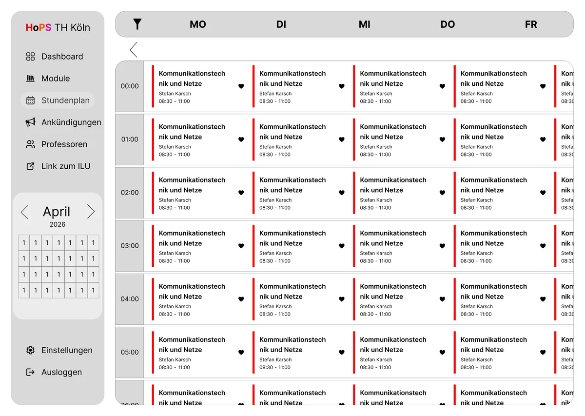 Im Rahmen des Screendesign-Projekts 2025/26 wurde ein umfassendes Redesign für den aktuell genutzten Stundenplan der TH Köln (HOPS) entwickelt. Das HOPS ist eine Plattform, die alle Studenten der TH Köln nutzen und daher eine Anwendung ist, auf die man nicht verzichten kann. Angesichts der Bedeutung dieser Anwendung war es das Ziel des Projekts, die visuelle Gestaltung zu modernisieren und dabei ein elegantes, ansprechendes und zeitgemäßes Design zu gestalten, ohne jedoch zu aufdringlich oder erdrückend zu wirken, wie das bis jetzt der Fall war.