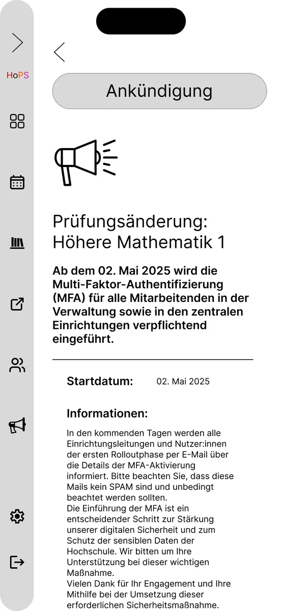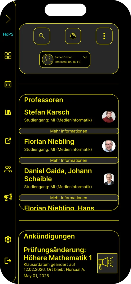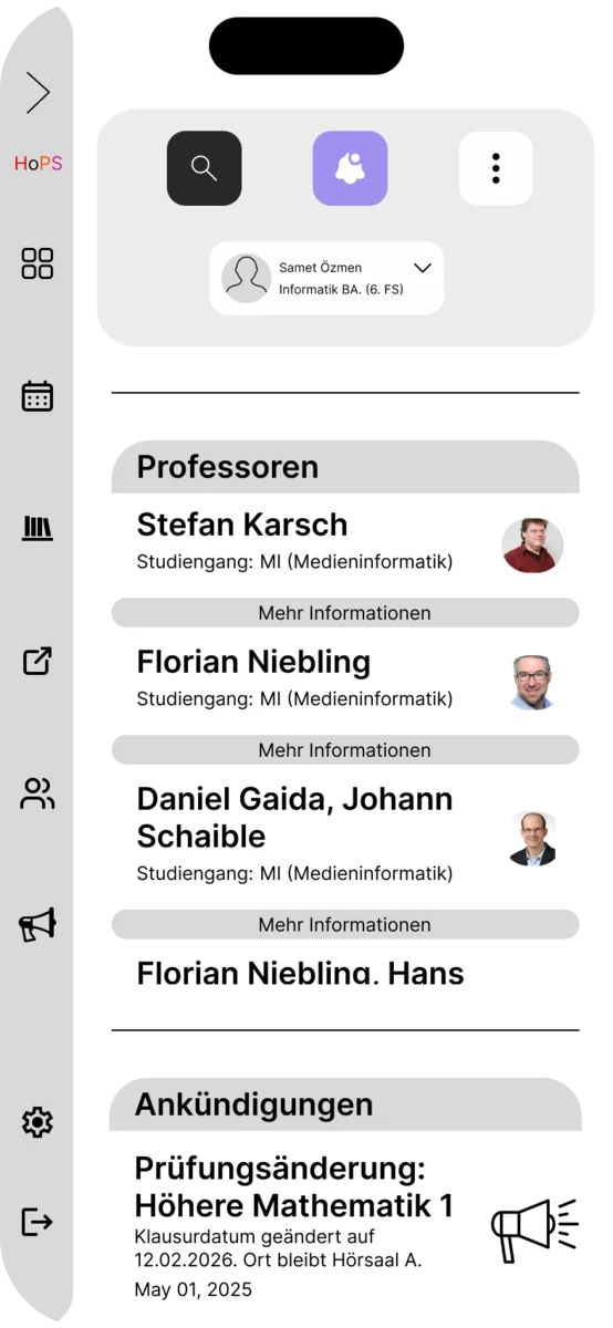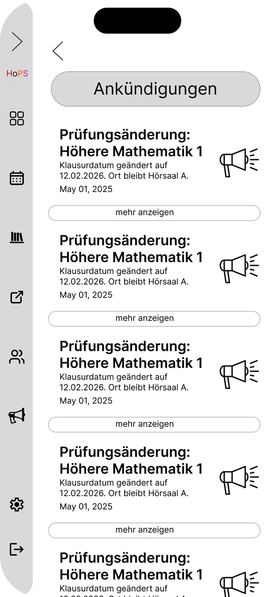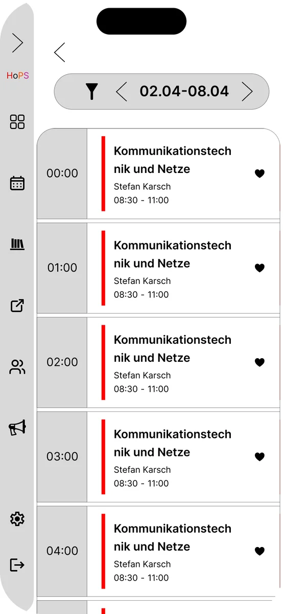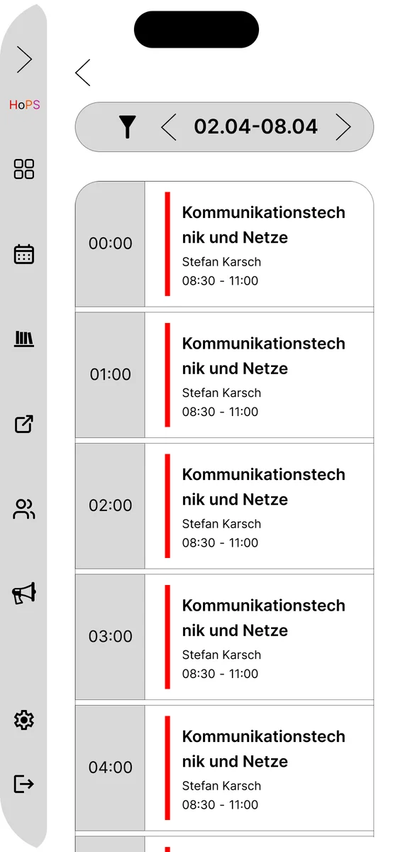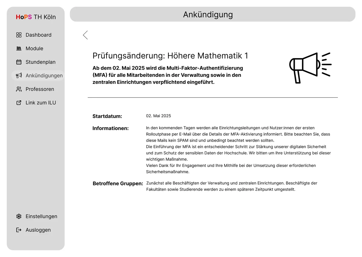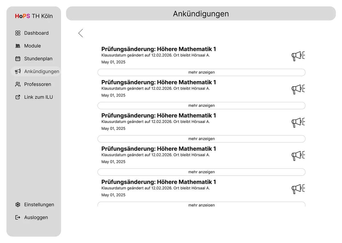 Im Rahmen des Screendesign-Projekts 2025/26 wurde ein umfassendes Redesign für den aktuell genutzten Stundenplan der TH Köln (HOPS) entwickelt. Das HOPS ist eine Plattform, die alle Studenten der TH Köln nutzen und daher eine Anwendung ist, auf die man nicht verzichten kann. Angesichts der Bedeutung dieser Anwendung war es das Ziel des Projekts, die visuelle Gestaltung zu modernisieren und dabei ein elegantes, ansprechendes und zeitgemäßes Design zu gestalten, ohne jedoch zu aufdringlich oder erdrückend zu wirken, wie das bis jetzt der Fall war.