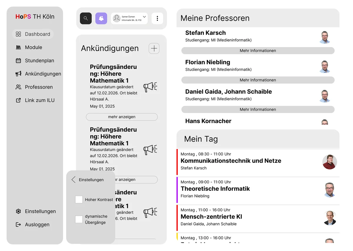 Dabei wurde auch ein barrierefreier Modus berücksichtigt, um die Zugänglichkeit für alle Nutzer:innen zu verbessern. Die Hauptzielgruppe des Stundenplanes sind die Studenten und Professoren der TH Köln, die die Plattform für ihre Arbeit bzw. für ihr Studium an der TH nutzen. Darüber hinaus soll das Redesign auch ein breiteres Publikum ansprechen, das gerne die Plattform nutzen möchte, ohne das Gefühl zu haben, von Informationen erdrückt zu werden. Zu Beginn des Projekts haben wir den Desktop-Screen als Basis für das Design gewählt, um eine übersichtliche und funktionale Struktur zu entwickeln. Da haben wir uns für ein Dashboard als zentralen Angelpunkt für alle unsere Unterfenster entschieden. Im Anschluss wurden auch für Mobilgeräte entsprechende Entwürfe erstellt, um eine durchgängig benutzerfreundliche Erfahrung auf allen Plattformen zu gewährleisten.