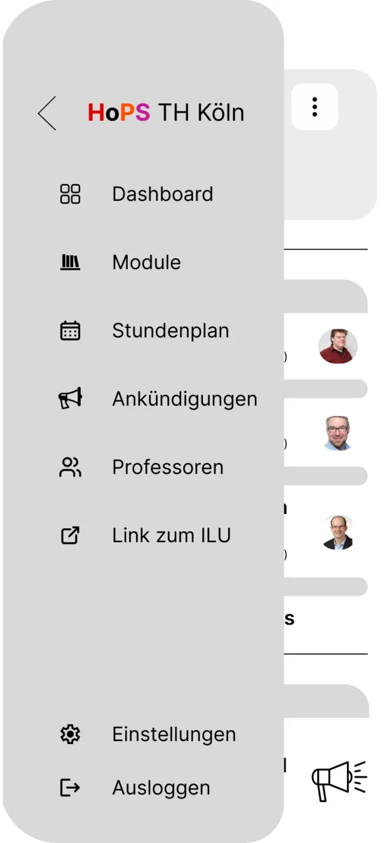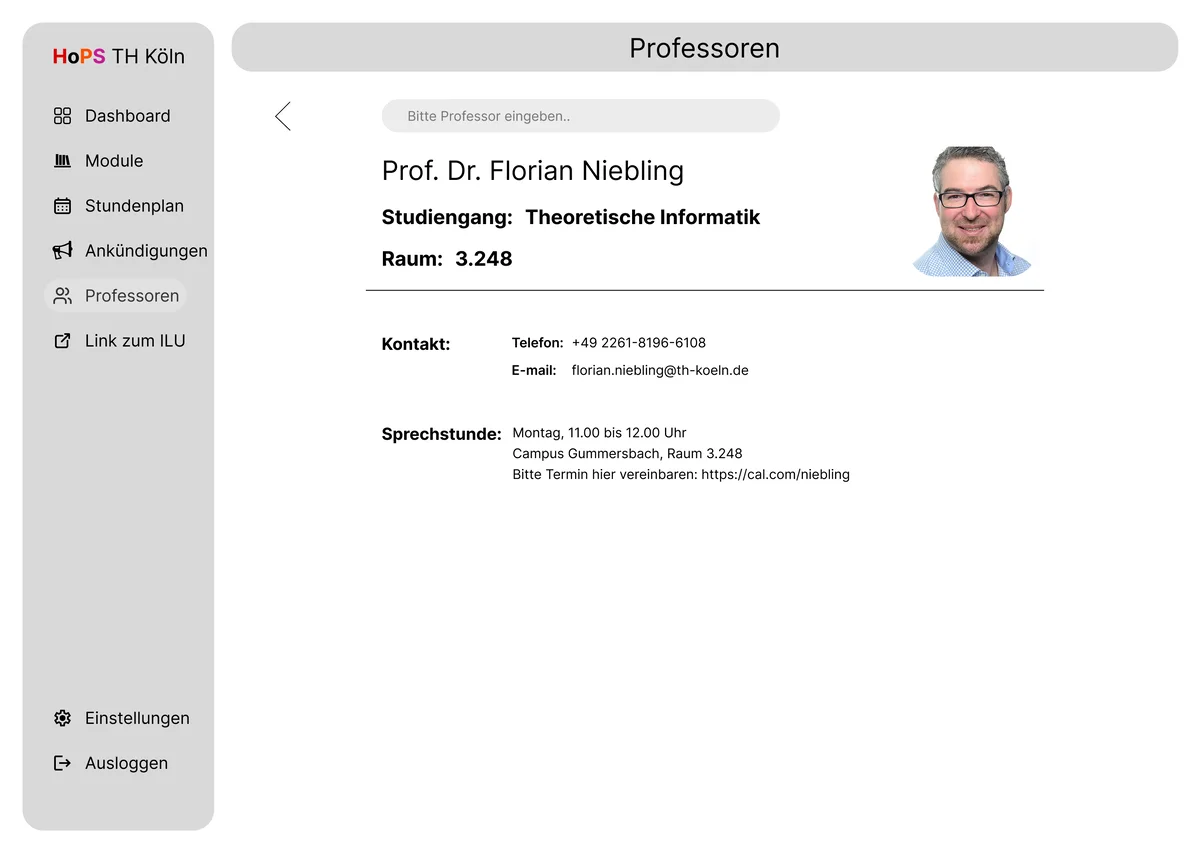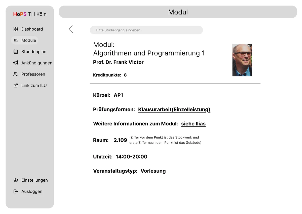 Auf der Startseite befindet sich mittig in der Seitenleiste ein Link-Button. Bei einem Klick darauf öffnet sich ein Fenster, in dem das ILU aufgerufen wird. Da war es uns wichtig, dass wir das ILU direkt in die Anwendung integrieren, um mehr Verbindung zu den vielen anderen Anwendungen der TH Köln zu schaffen. Ebenso bieten wir eine Möglichkeit des Anmeldens an. Dieses soll für die Informationsspeicherung sprechen; sprich, wenn man einen Stundenplan anpasst oder seine Filter setzt, wird es accountbasiert gespeichert. Ebenso dient das dazu, um die Pflichtmodule des jeweiligen Studiengangs zu ermitteln und die anderen Module der anderen Studiengänge als optional anzubieten, wie z. B. WPFs. Ankündigungen, die über ILU herausgeschickt werden, würden durch die Einbindung der Campus-ID als Account dafür sorgen, dass auch diese in unserer Anwendung angezeigt werden. Außerdem haben wir zusätzlich mehr Funktionen eingebaut als auf der aktuellen Webseite, um die Seite einladender und interessanter zu gestalten. Ein Beispiel dafür wäre das Professorenfenster sowie ein Fenster für eine Modulansicht. Das sind Funktionen, die normalerweise immer auf verschiedenen Seiten angeboten wurden, während wir jedoch die Notwendigkeit sahen, alles in einer Anwendung festzuhalten.