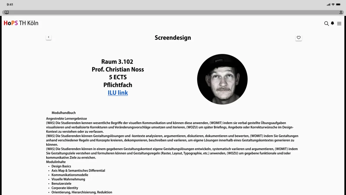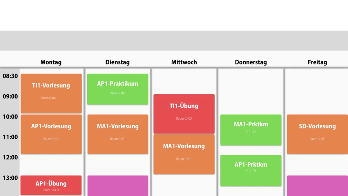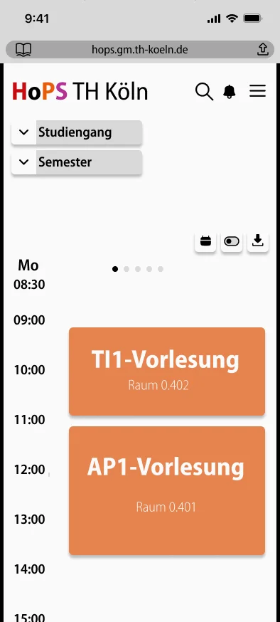 Dieser begann damit, dass wir uns den aktuellen Stundenplan der TH Köln angeguckt haben, um zu evaluieren, was man ändern muss, übernehmen kann und neu hinzufügen muss. Da ist uns direkt aufgefallen, dass man nur sehr umständlich zu seinem benötigten Stundenplan kommt und jener auch nicht wirklich modern genug für eine Technische Hochschule designt wurde. Daher haben wir uns andere Kalender wie die von Apple, Google und Co. angeschaut, um ein paar Ideen für eine Designrichtung zu bekommen.