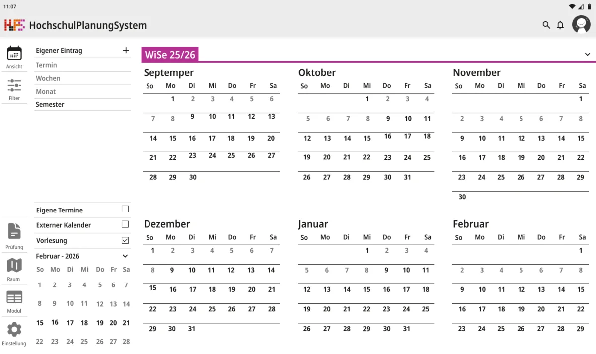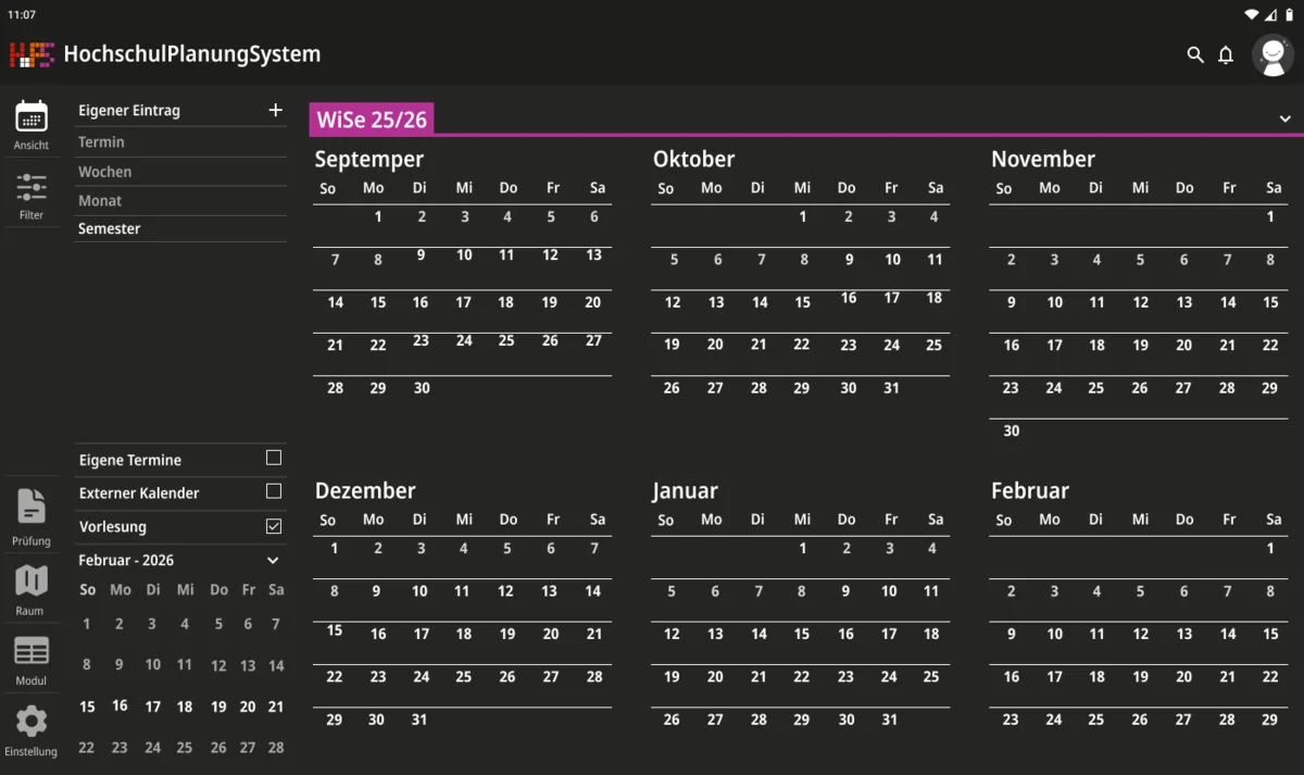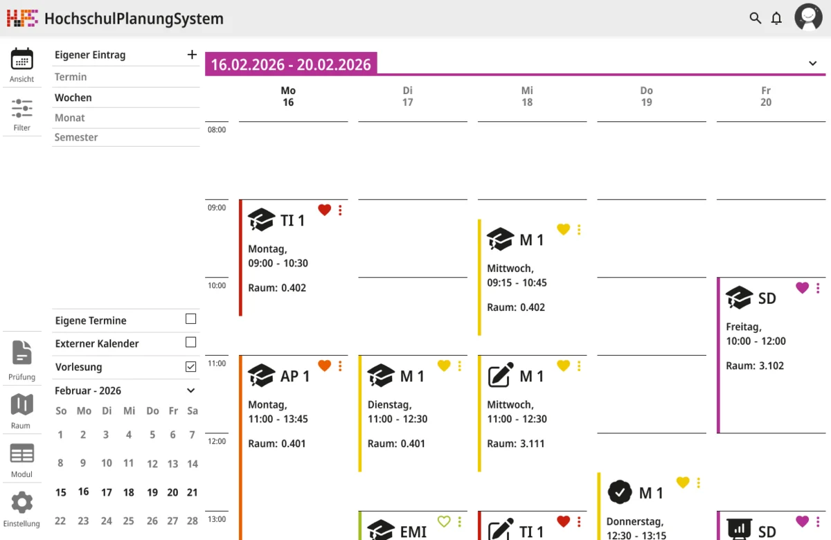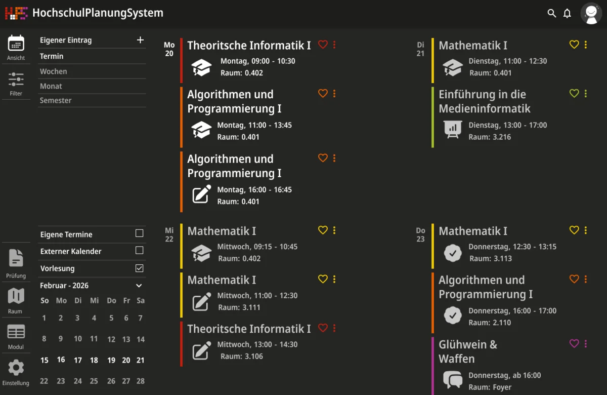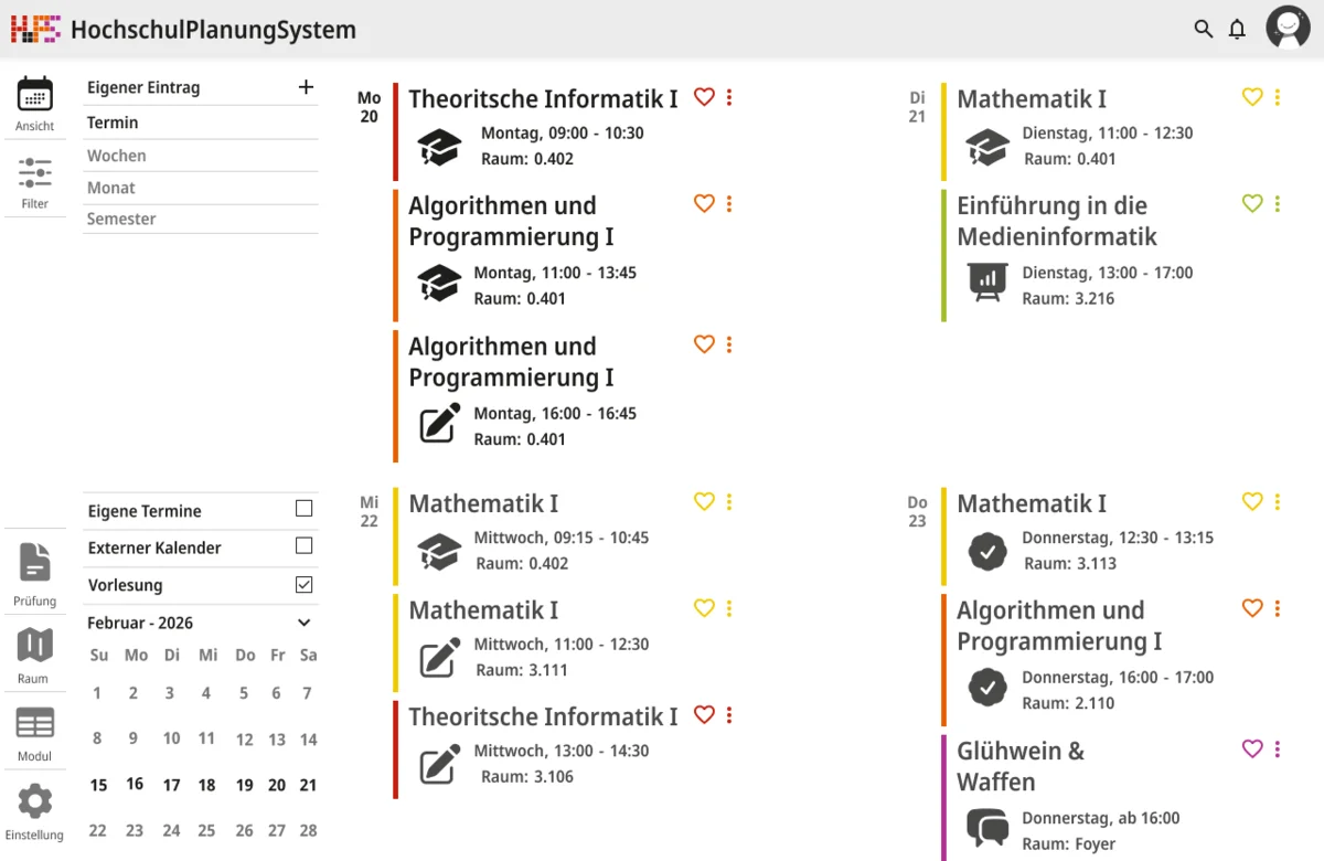 Darauf aufbauend wurde nicht nur die visuelle Gestaltung überarbeitet, sondern auch der Funktionsumfang erweitert. Ein zentraler Schwerpunkt lag auf individuellen Anpassungsmöglichkeiten. Funktionen wie Favoriten und differenzierte Einstellungen ermöglichen es, den eigenen Stundenplan gezielt zu strukturieren und häufig benötigte Termine schneller zu erreichen. Gleichzeitig wurde der Zugriff auf wesentliche Informationen vereinfacht, sodass Angaben zu Zeit, Ort und Datum unmittelbar sichtbar sind und ohne zusätzliche Schritte abgerufen werden können. Die Anwendung wurde in mehrere Ansichtsformen gegliedert, um unterschiedliche Planungsperspektiven abzudecken. Dazu zählen eine effiziente Terminansicht, sowie eine Wochen- und Monatsübersicht. Während mobile Endgeräte eine kompakte und klar strukturierte Darstellung erhalten, bietet die Desktop-Version zusätzlich eine erweiterte Option für eine langfristige Organisation. Beide Varianten sind funktional gleichwertig, berücksichtigen jedoch gezielt die jeweiligen Nutzungssituationen.