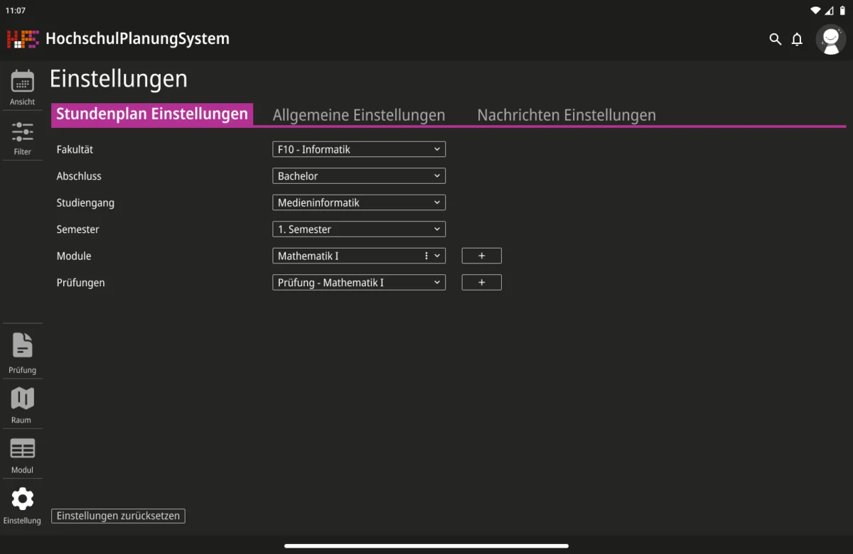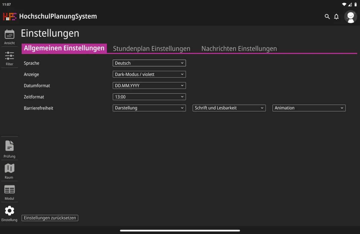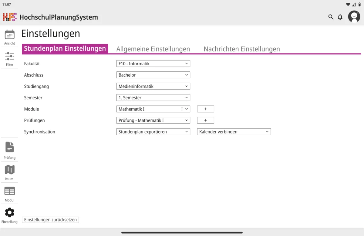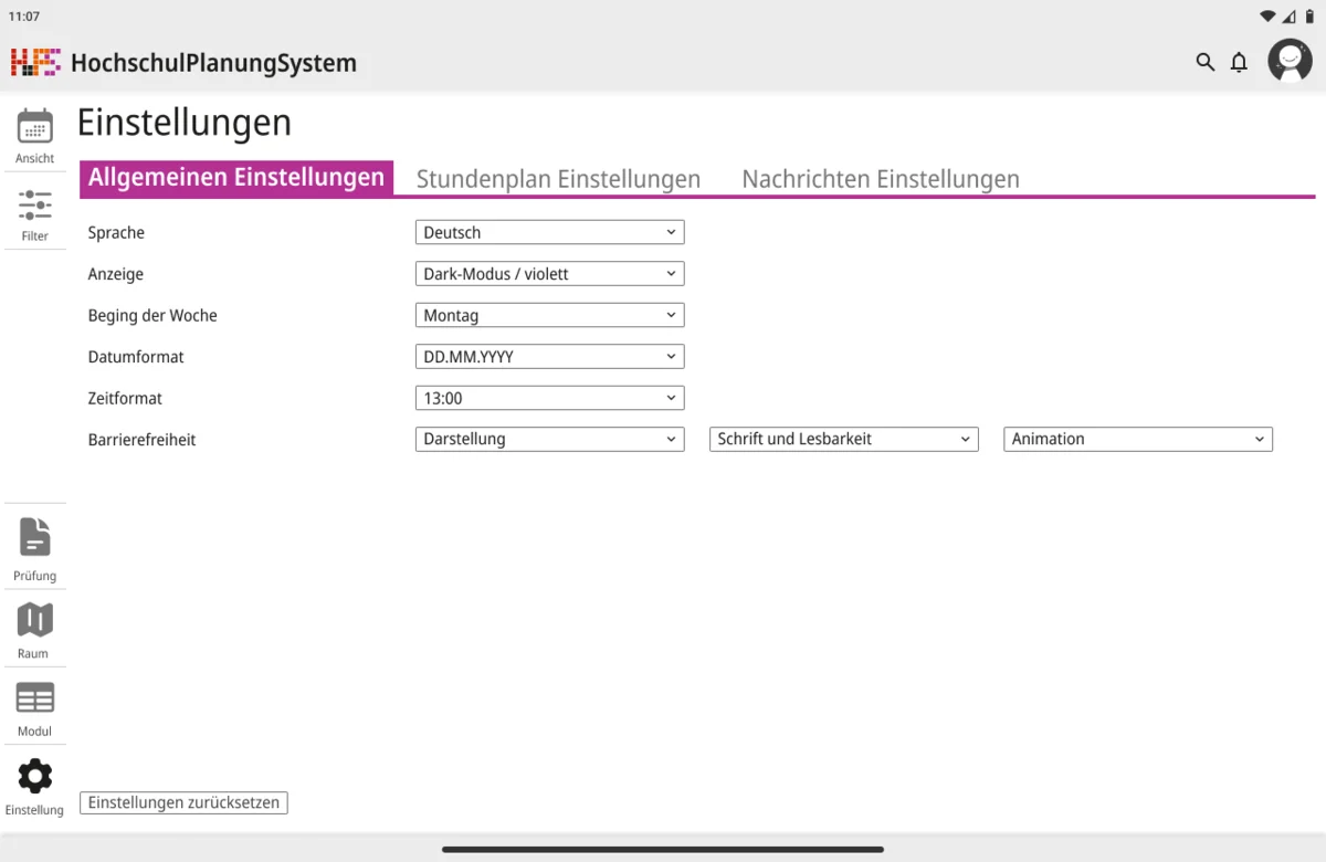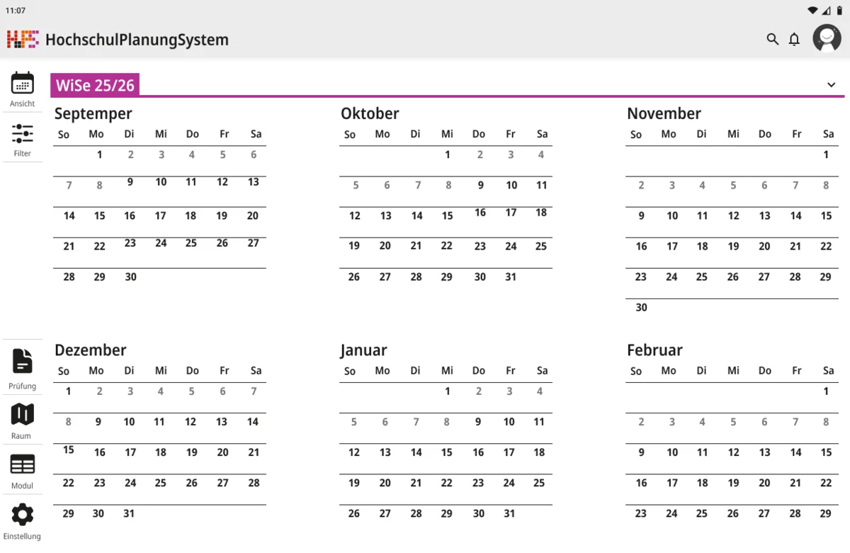 Darauf aufbauend wurde nicht nur die visuelle Gestaltung überarbeitet, sondern auch der Funktionsumfang erweitert. Ein zentraler Schwerpunkt lag auf individuellen Anpassungsmöglichkeiten. Funktionen wie Favoriten und differenzierte Einstellungen ermöglichen es, den eigenen Stundenplan gezielt zu strukturieren und häufig benötigte Termine schneller zu erreichen. Gleichzeitig wurde der Zugriff auf wesentliche Informationen vereinfacht, sodass Angaben zu Zeit, Ort und Datum unmittelbar sichtbar sind und ohne zusätzliche Schritte abgerufen werden können. Die Anwendung wurde in mehrere Ansichtsformen gegliedert, um unterschiedliche Planungsperspektiven abzudecken. Dazu zählen eine effiziente Terminansicht, sowie eine Wochen- und Monatsübersicht. Während mobile Endgeräte eine kompakte und klar strukturierte Darstellung erhalten, bietet die Desktop-Version zusätzlich eine erweiterte Option für eine langfristige Organisation. Beide Varianten sind funktional gleichwertig, berücksichtigen jedoch gezielt die jeweiligen Nutzungssituationen.