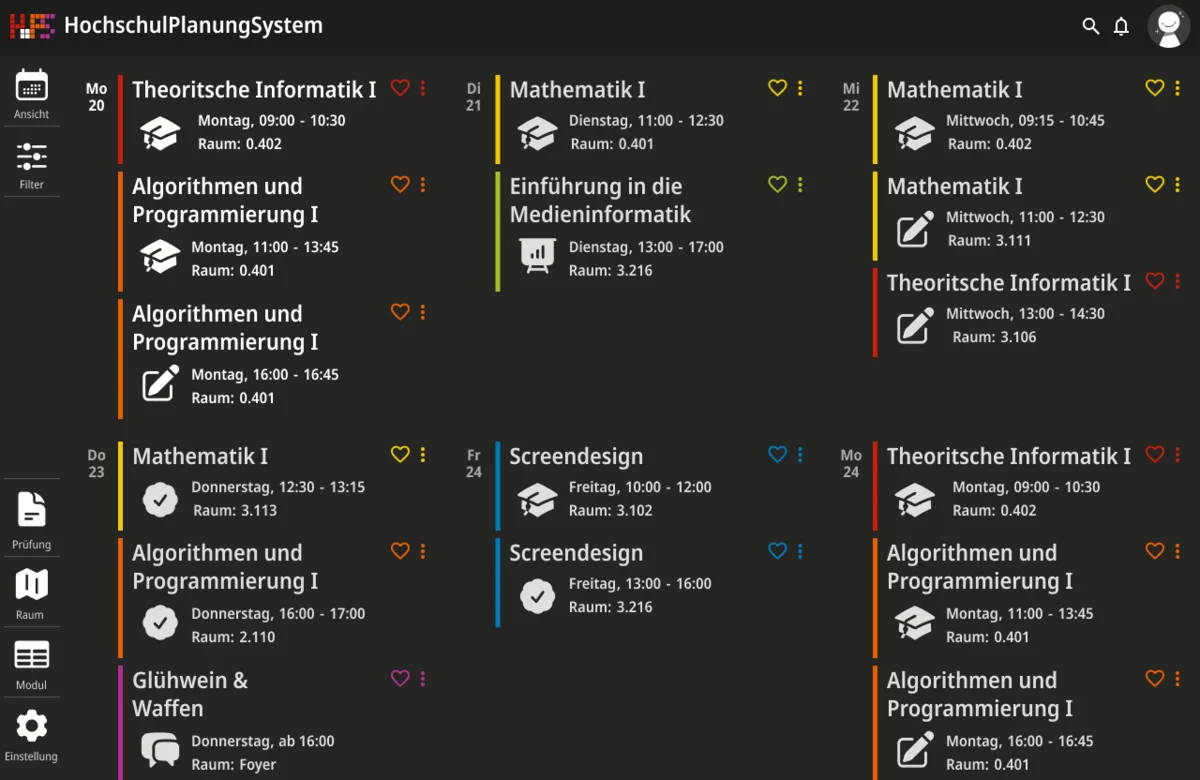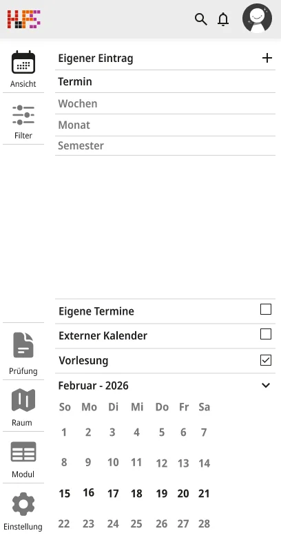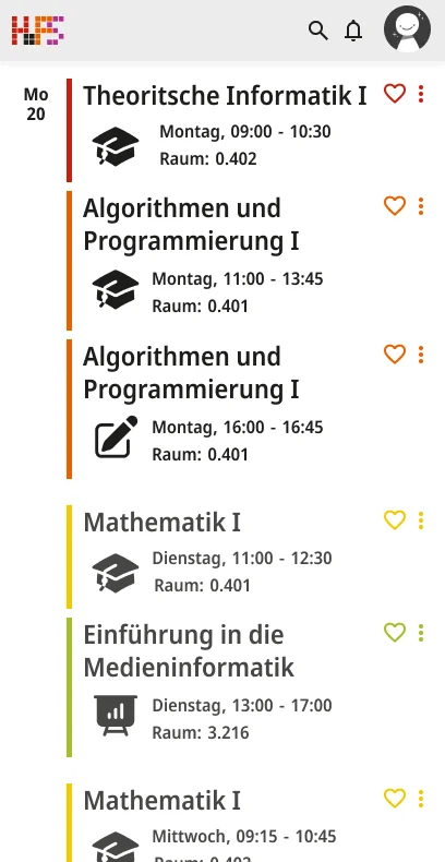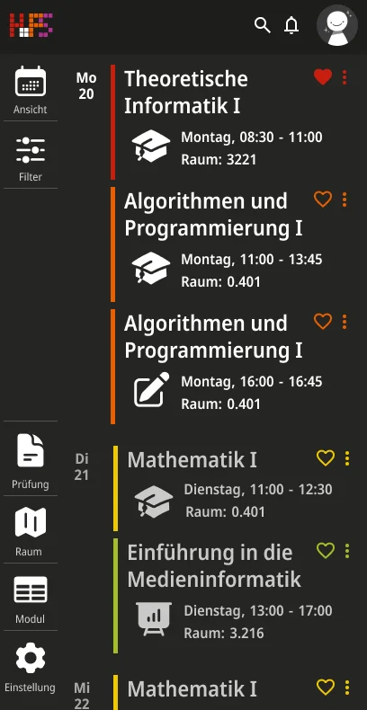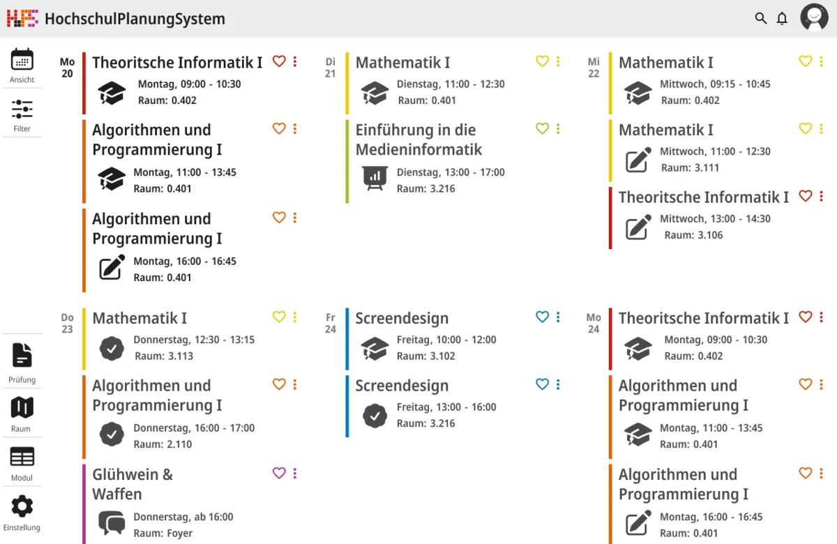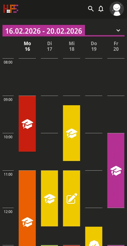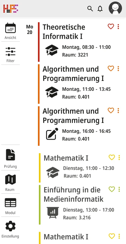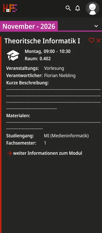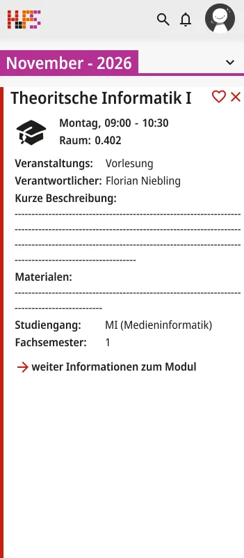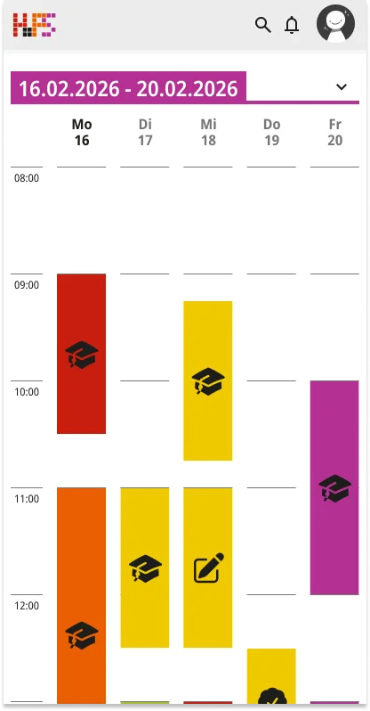 Ein weiterer Schwerpunkt lag bei der Informationsvermittlung. Die Oberfläche zeigt zunächst nur die wichtigsten Inhalte, um Überforderung zu vermeiden. Detaillierte Angaben werden erst bei Interaktion sichtbar, wodurch eine klare Struktur erhalten bleibt, ohne auf Informationsvielfalt zu verzichten. Der gestalterische Ansatz folgt dem Prinzip, eine intuitive, flexible und übersichtliche Lösung zu schaffen. Inhalte werden reduziert und visuell hervorgehoben, sodass Termine schnell erfassbar sind. Farbige Markierungen ermöglichen die individuelle Kennzeichnung von Modulen und unterstützen so die persönliche Orientierung innerhalb des Stundenplans. Ergänzend dazu werden Icons eingesetzt, die den jeweiligen Veranstaltungstyp innerhalb eines Moduls visualisieren und eine schnelle inhaltliche Einordnung erlauben. Auch die Navigation wurde bewusst klar und konsistent gestaltet. Wichtige Bereiche sind jederzeit erreichbar und logisch voneinander getrennt. Während auf größeren Bildschirmen eine seitliche Struktur die Orientierung unterstützt, werden Inhalte auf mobilen Geräten stärker vertikal organisiert.