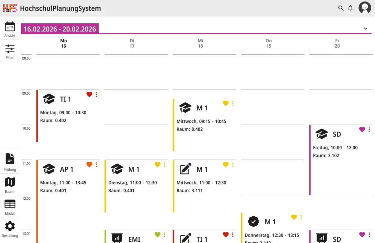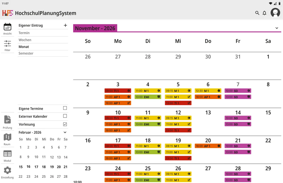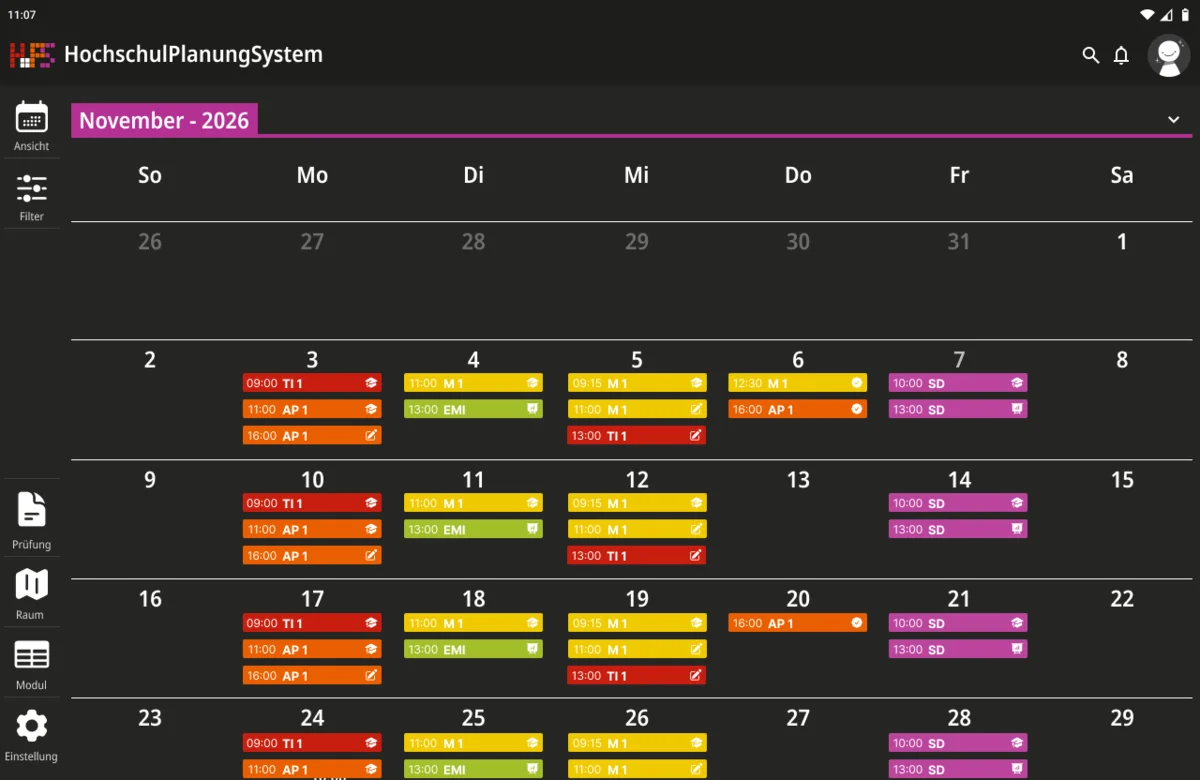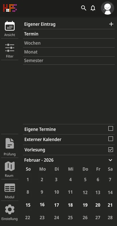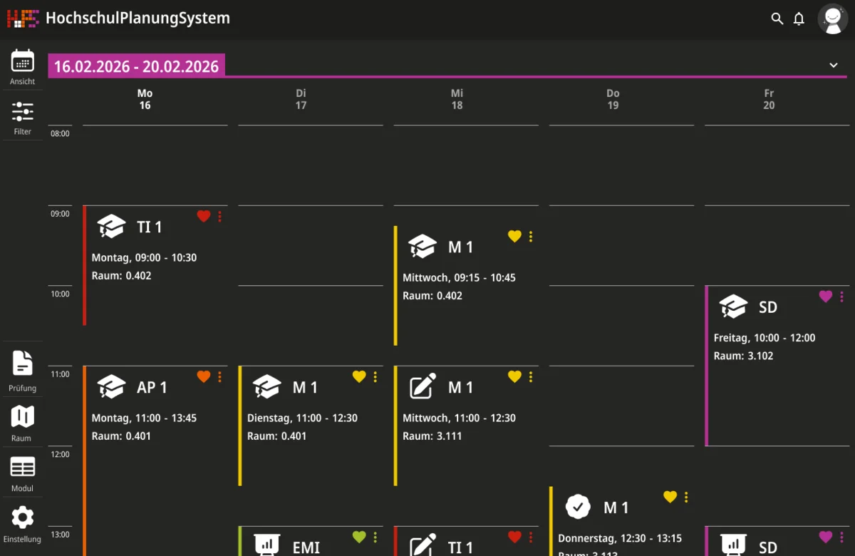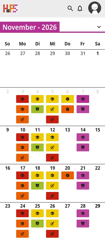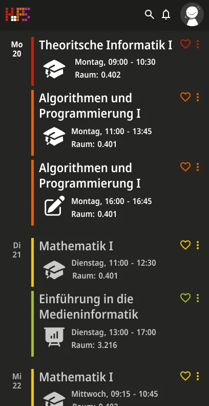 Ein weiterer Schwerpunkt lag bei der Informationsvermittlung. Die Oberfläche zeigt zunächst nur die wichtigsten Inhalte, um Überforderung zu vermeiden. Detaillierte Angaben werden erst bei Interaktion sichtbar, wodurch eine klare Struktur erhalten bleibt, ohne auf Informationsvielfalt zu verzichten. Der gestalterische Ansatz folgt dem Prinzip, eine intuitive, flexible und übersichtliche Lösung zu schaffen. Inhalte werden reduziert und visuell hervorgehoben, sodass Termine schnell erfassbar sind. Farbige Markierungen ermöglichen die individuelle Kennzeichnung von Modulen und unterstützen so die persönliche Orientierung innerhalb des Stundenplans. Ergänzend dazu werden Icons eingesetzt, die den jeweiligen Veranstaltungstyp innerhalb eines Moduls visualisieren und eine schnelle inhaltliche Einordnung erlauben. Auch die Navigation wurde bewusst klar und konsistent gestaltet. Wichtige Bereiche sind jederzeit erreichbar und logisch voneinander getrennt. Während auf größeren Bildschirmen eine seitliche Struktur die Orientierung unterstützt, werden Inhalte auf mobilen Geräten stärker vertikal organisiert.