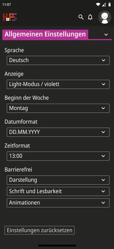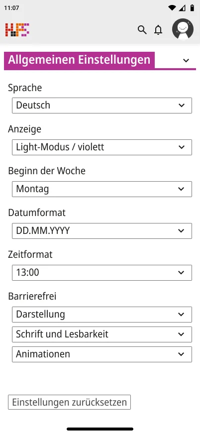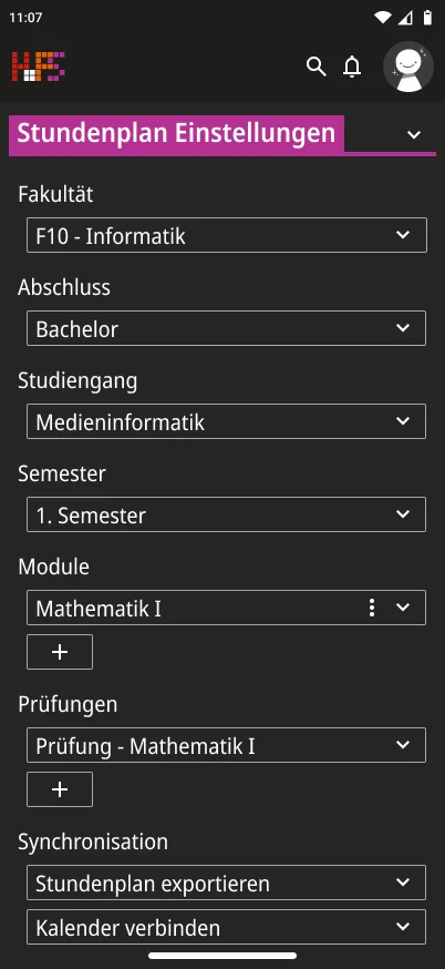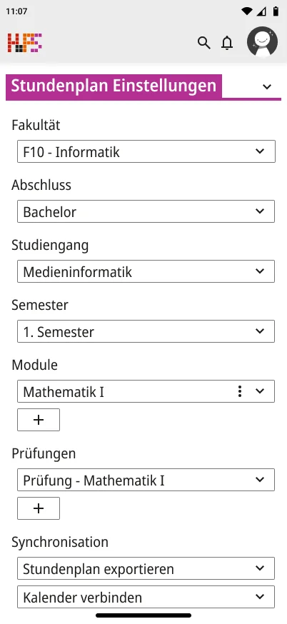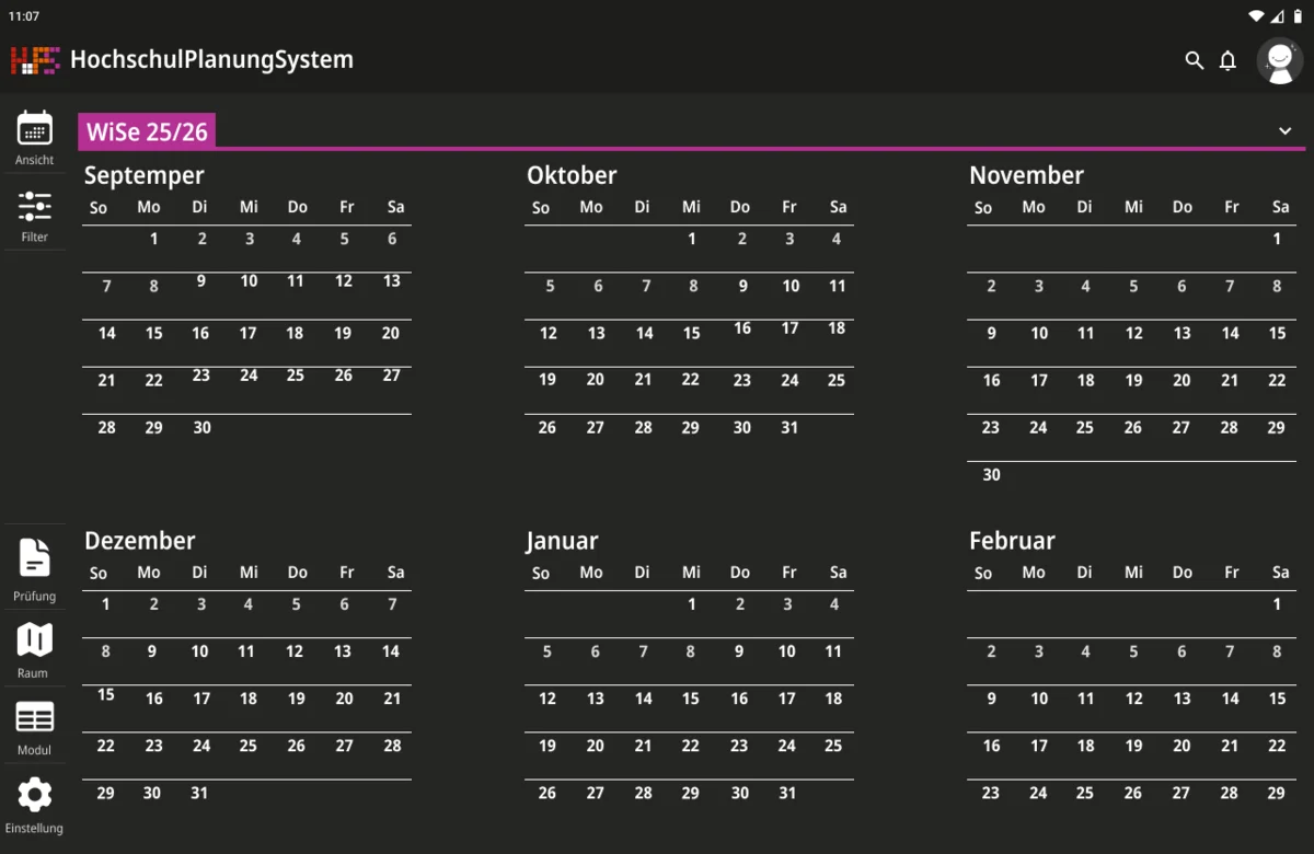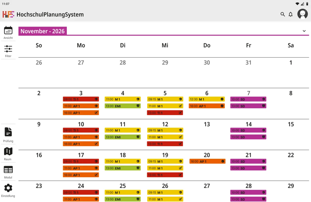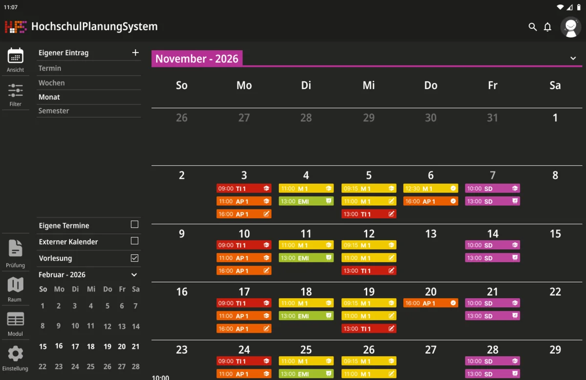 Ein weiterer Schwerpunkt lag bei der Informationsvermittlung. Die Oberfläche zeigt zunächst nur die wichtigsten Inhalte, um Überforderung zu vermeiden. Detaillierte Angaben werden erst bei Interaktion sichtbar, wodurch eine klare Struktur erhalten bleibt, ohne auf Informationsvielfalt zu verzichten. Der gestalterische Ansatz folgt dem Prinzip, eine intuitive, flexible und übersichtliche Lösung zu schaffen. Inhalte werden reduziert und visuell hervorgehoben, sodass Termine schnell erfassbar sind. Farbige Markierungen ermöglichen die individuelle Kennzeichnung von Modulen und unterstützen so die persönliche Orientierung innerhalb des Stundenplans. Ergänzend dazu werden Icons eingesetzt, die den jeweiligen Veranstaltungstyp innerhalb eines Moduls visualisieren und eine schnelle inhaltliche Einordnung erlauben. Auch die Navigation wurde bewusst klar und konsistent gestaltet. Wichtige Bereiche sind jederzeit erreichbar und logisch voneinander getrennt. Während auf größeren Bildschirmen eine seitliche Struktur die Orientierung unterstützt, werden Inhalte auf mobilen Geräten stärker vertikal organisiert.