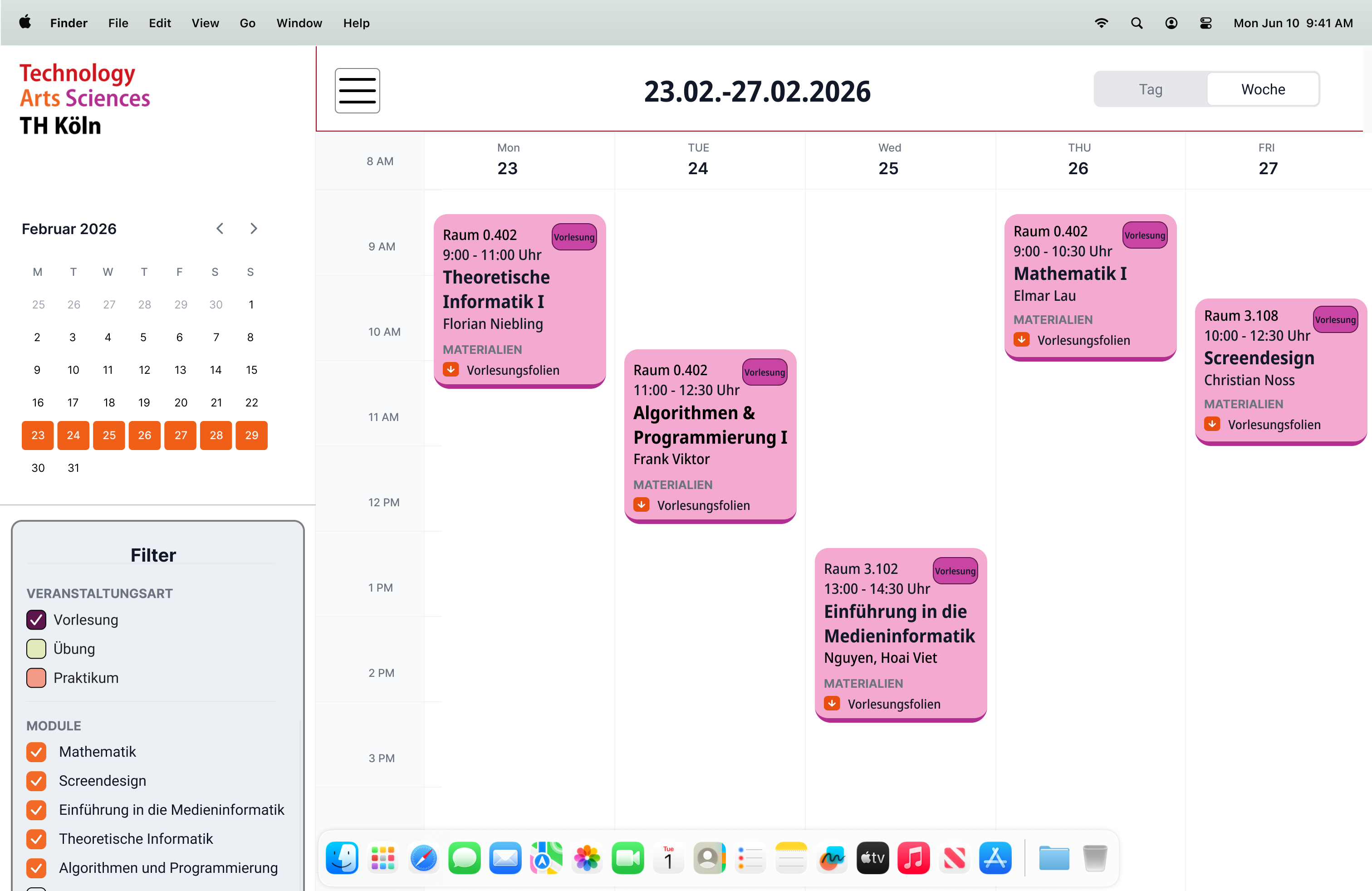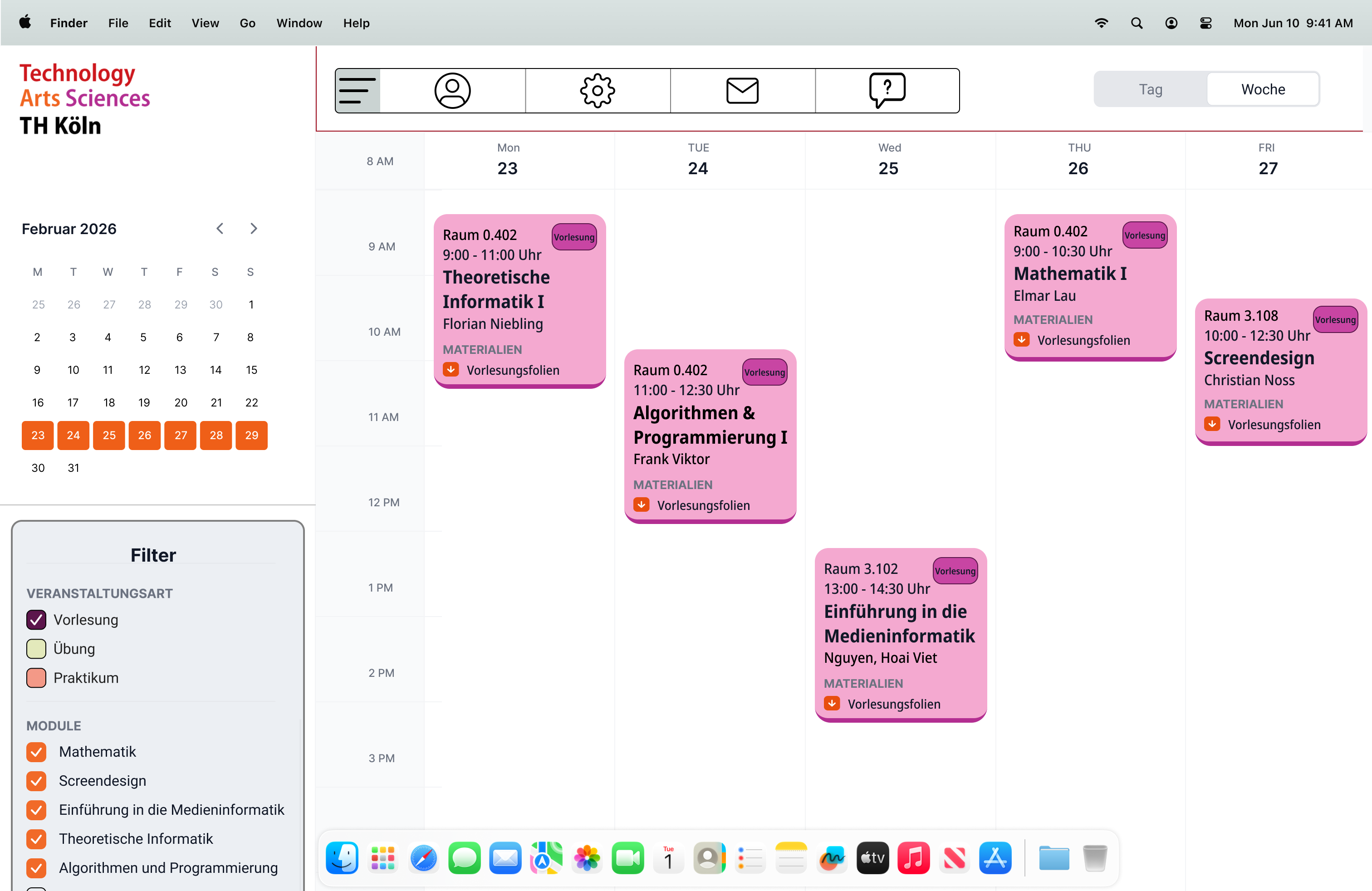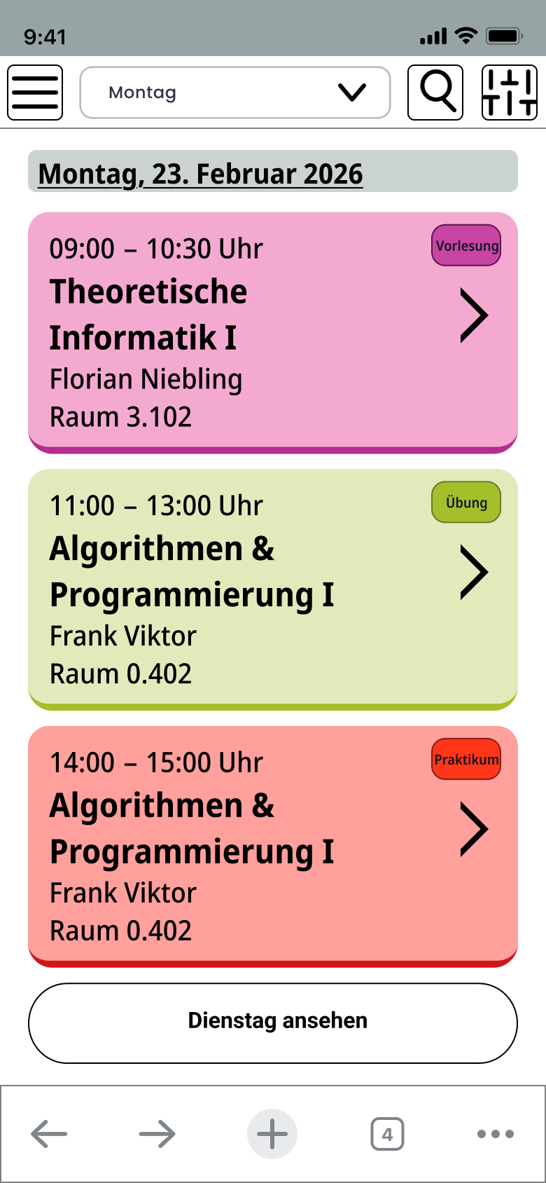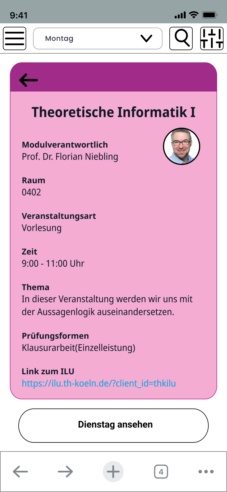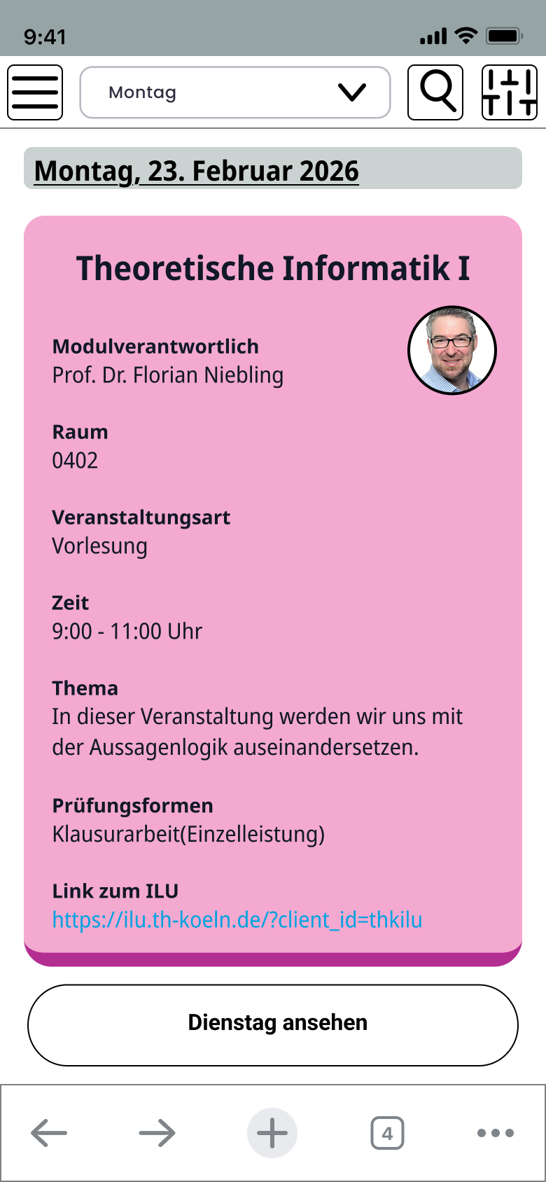 In der mobilen Wochenansicht werden die Veranstaltungen in Modulkästen dargestellt, die die wichtigsten Infos wie Dozent, Raum, Uhrzeit und Titel enthalten. Zur besseren Unterscheidung der Veranstaltungsarten wurde mit Farben gearbeitet, angelehnt an das Design der TH Köln. Zum Beispiel wurden Vorlesungen in Violetttönen dargestellt, ergänzt durch kleine farbige Balken, die nach deren Veranstaltungsart beschriftet wurden und zusätzlich Orientierung bieten. Dadurch kann der Stakeholder die Inhalte schneller erfassen.