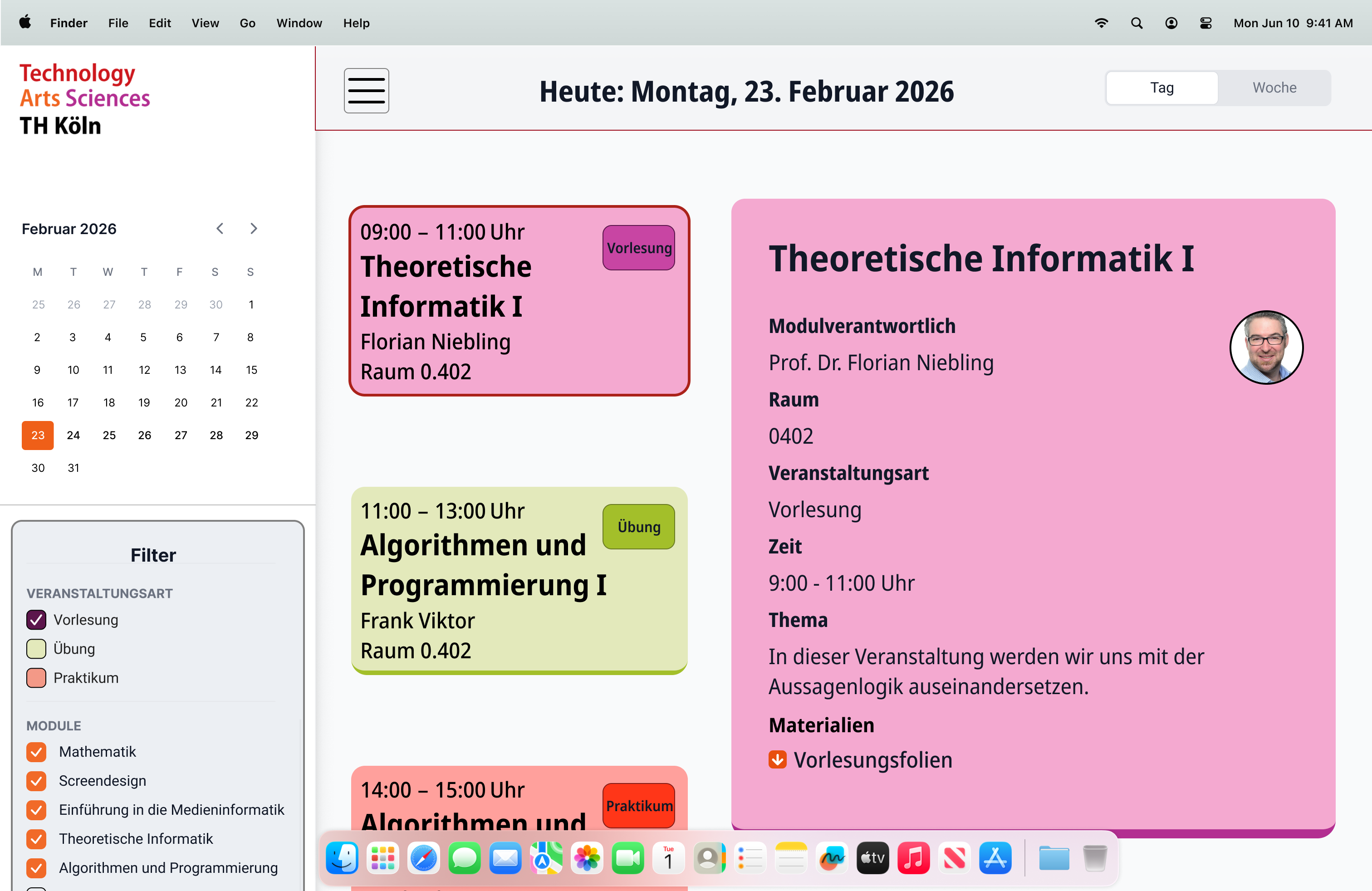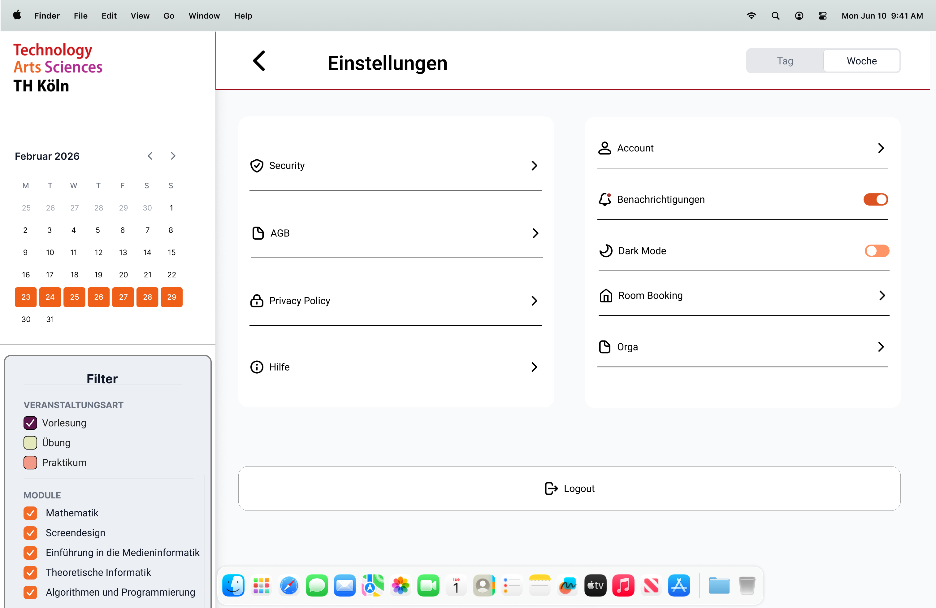 Die Nutzung folgt einem klaren Ablauf: Nach dem Login gelangt man direkt zur Wochenübersicht. Über eine obere Leiste kann man auf Profil, Einstellungen und Benachrichtigungen zugreifen. Die Filterfunktion ermöglicht es, bestimmte Veranstaltungen ein- oder auszublenden. In der Tagesansicht gibt es zusätzlich eine Detailansicht, die sich öffnet, wenn man ein Modul auswählt, sodass weitere Informationen angezeigt werden, ohne die Übersicht zu verlieren. Als weiteres Feature ist es möglich, die gezeigten Module zu favorisieren. Zur Unterscheidung ändern sich die Farbkontraste und Schriftfarbe, wodurch in gewisser Weise Elemente eines Dark Modes entstehen, auf den jedoch beim finalen Design kein besonderer Fokus gelegt wurde. Wie bei den anderen Elementen ermöglicht die Filterfunktion außerdem die Einsicht aller favorisierten Veranstaltungen.
