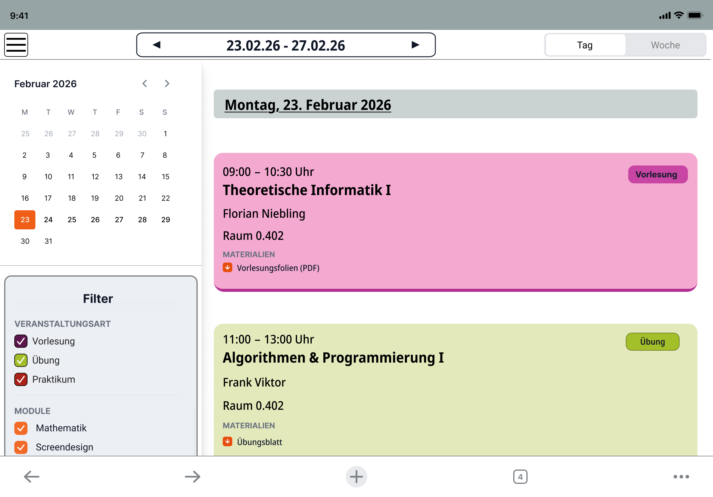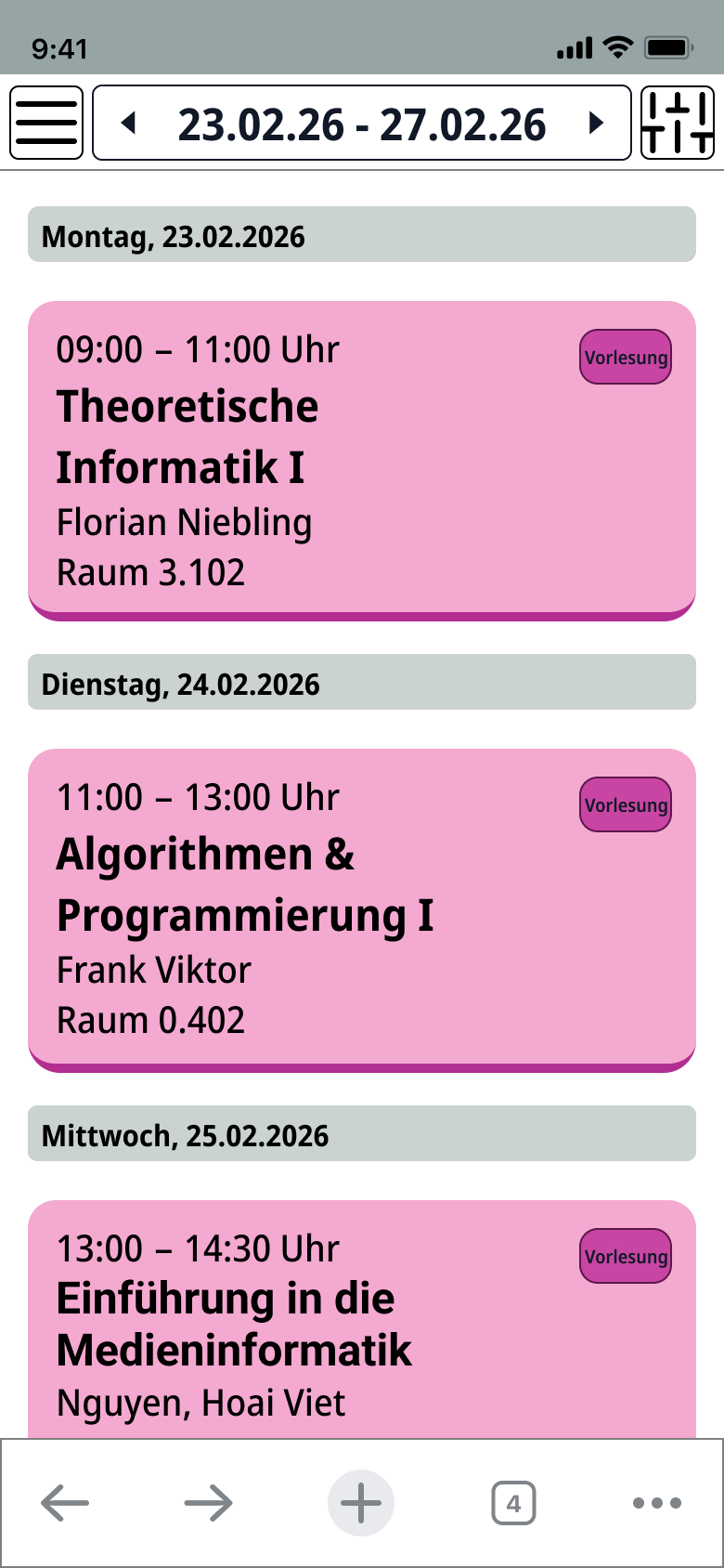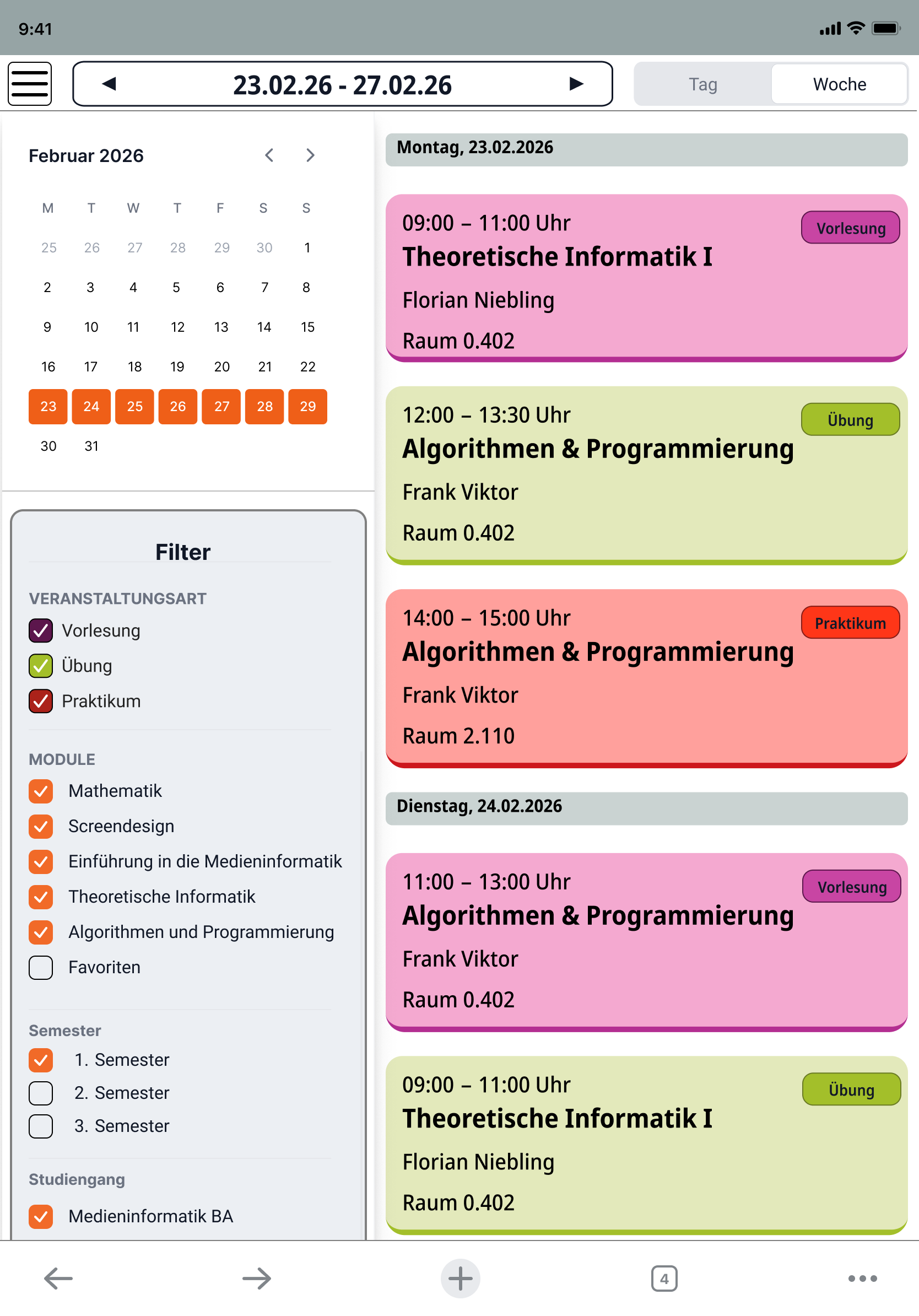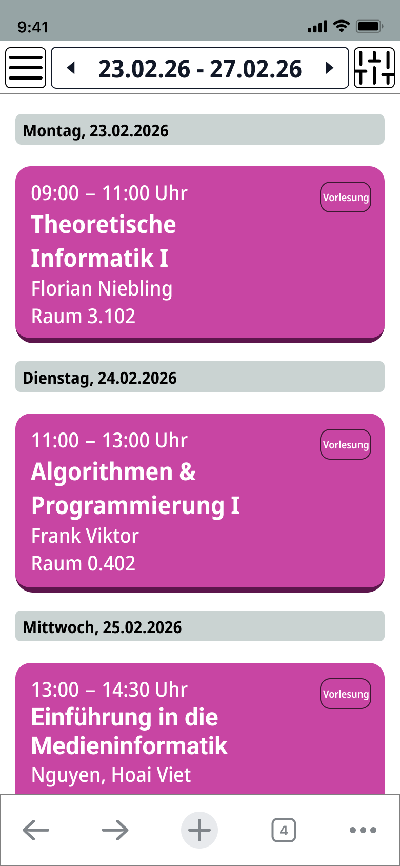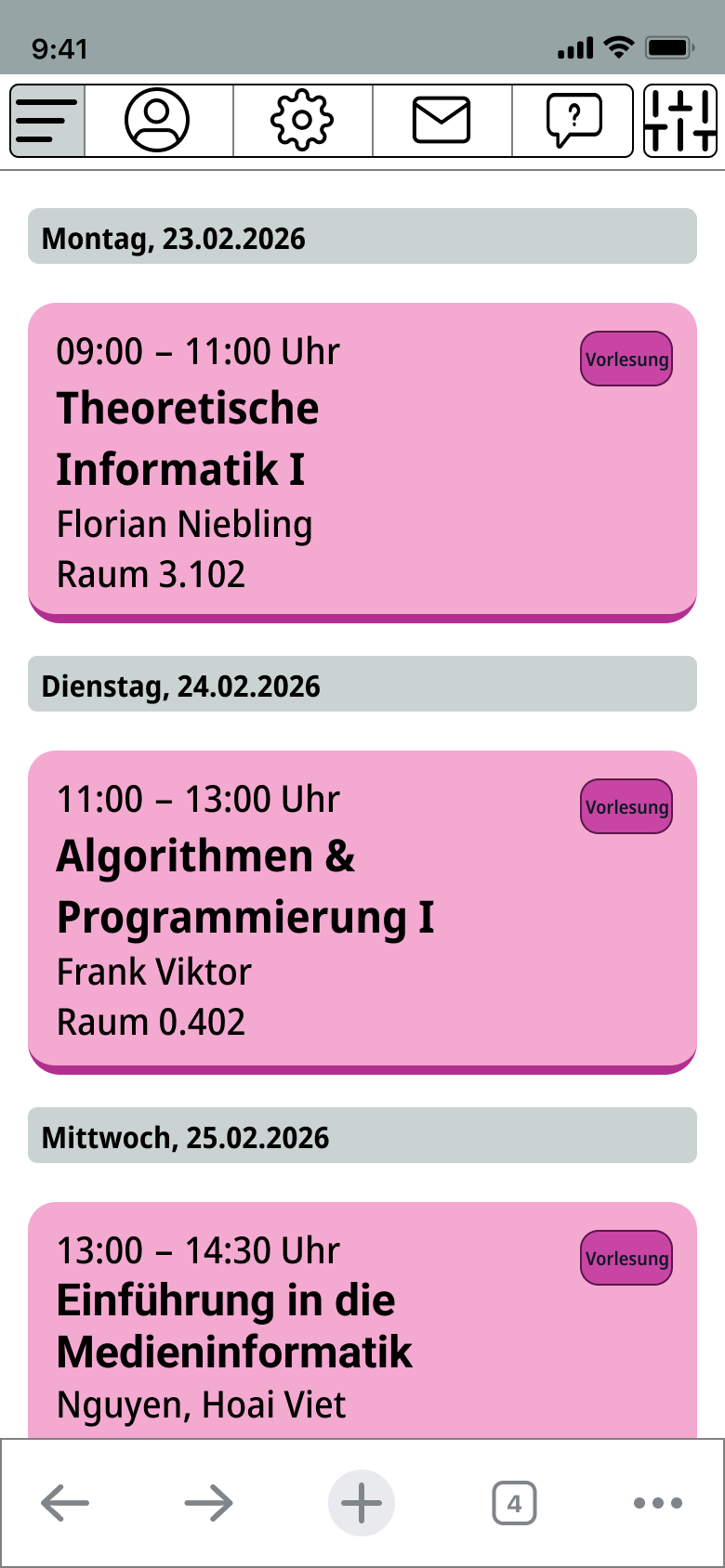 Insgesamt basiert das Konzept auf einem klaren System aus Inhalt, Farben und einem überschaubaren Layout. Dadurch entsteht ein einheitliches Design für alle Geräte. Auch Aspekte der Barrierefreiheit wurden durch gute Kontraste und klare Schrift berücksichtigt. Das Ergebnis ist ein übersichtliches Interface, das Studierenden den Alltag erleichtert und die Planung ihrer Veranstaltungen unterstützt.