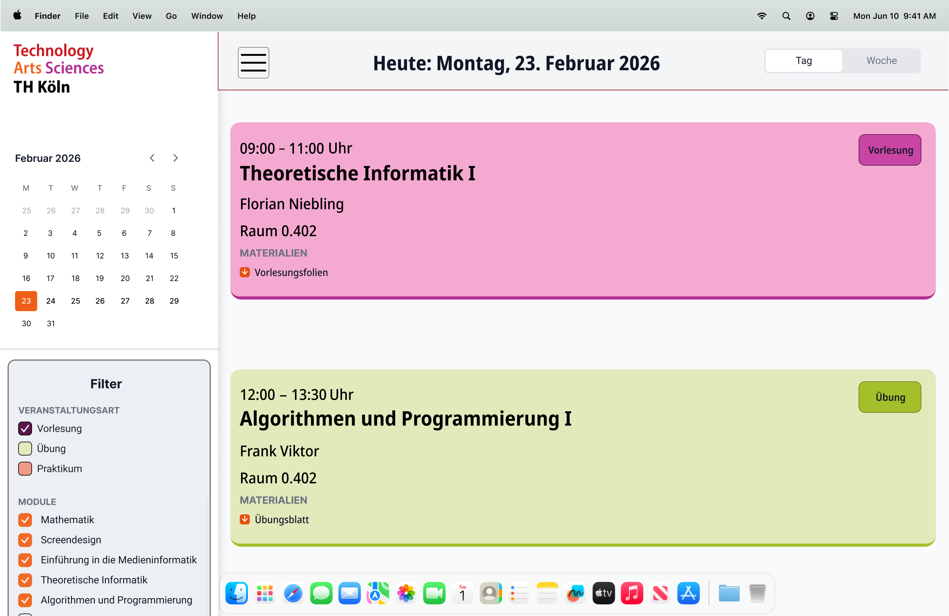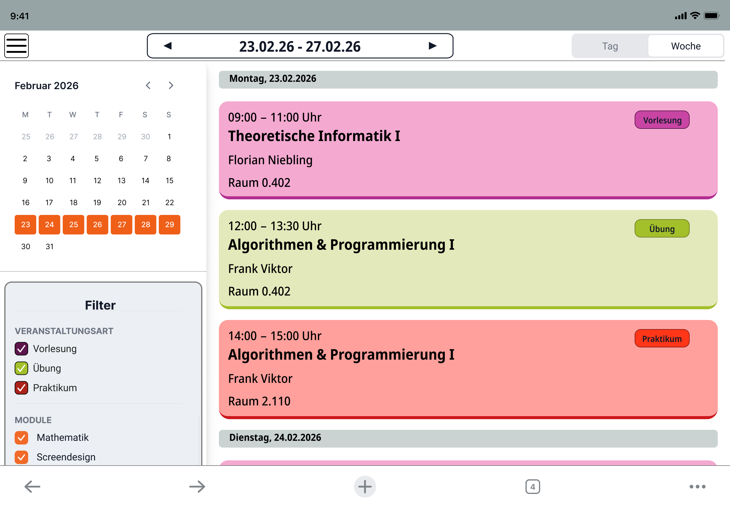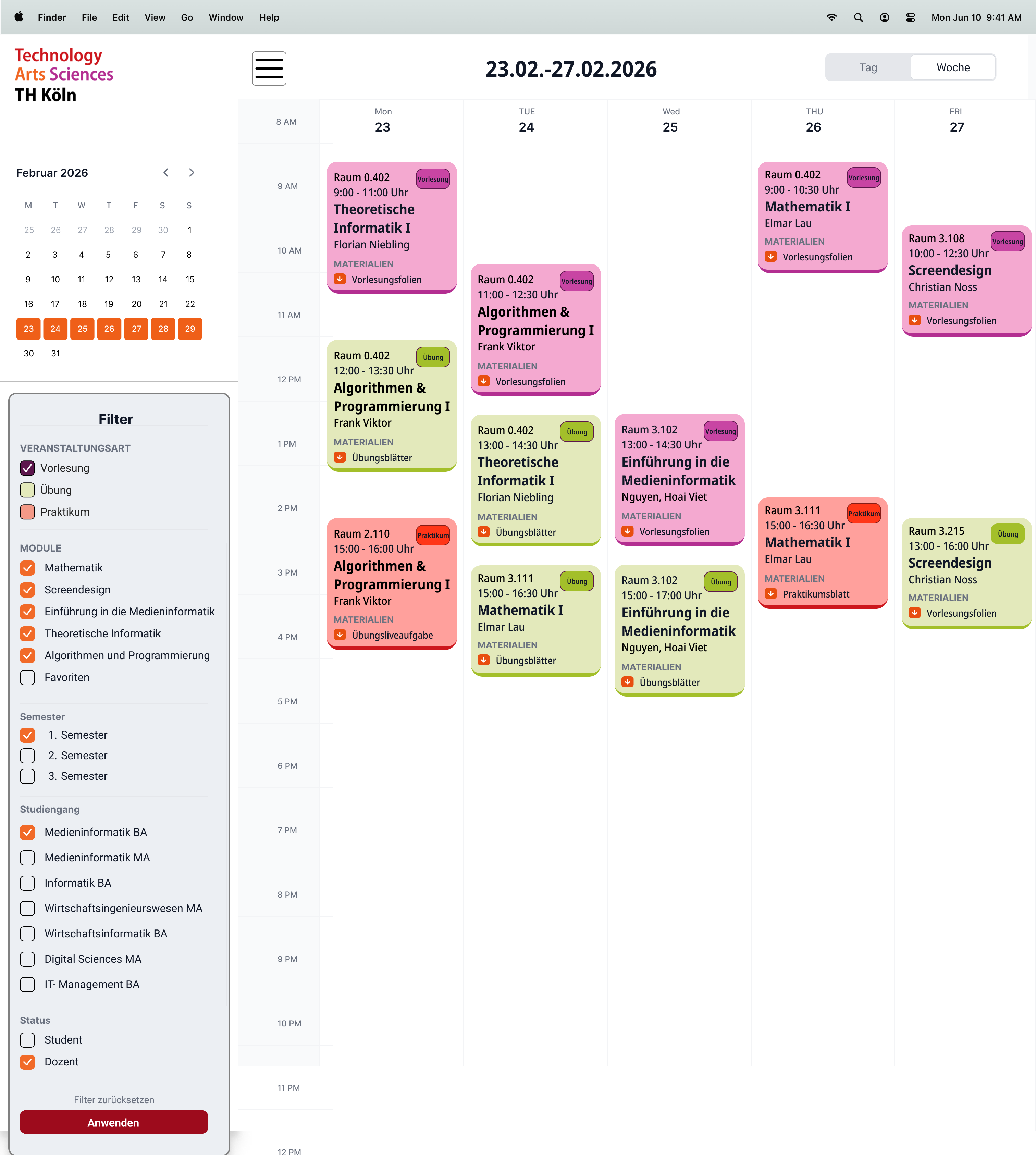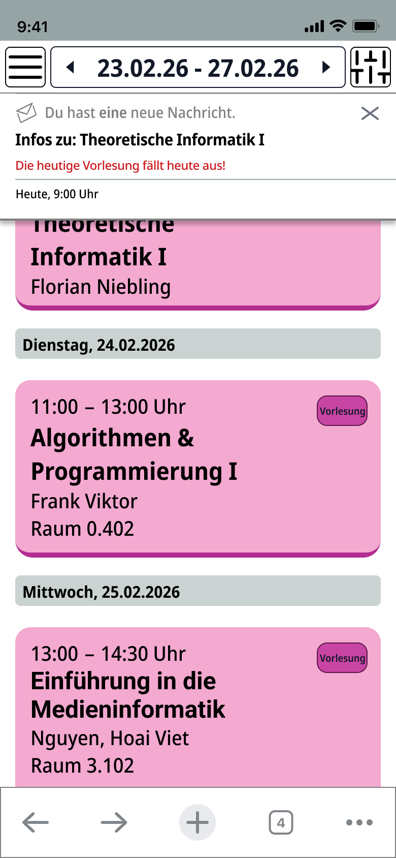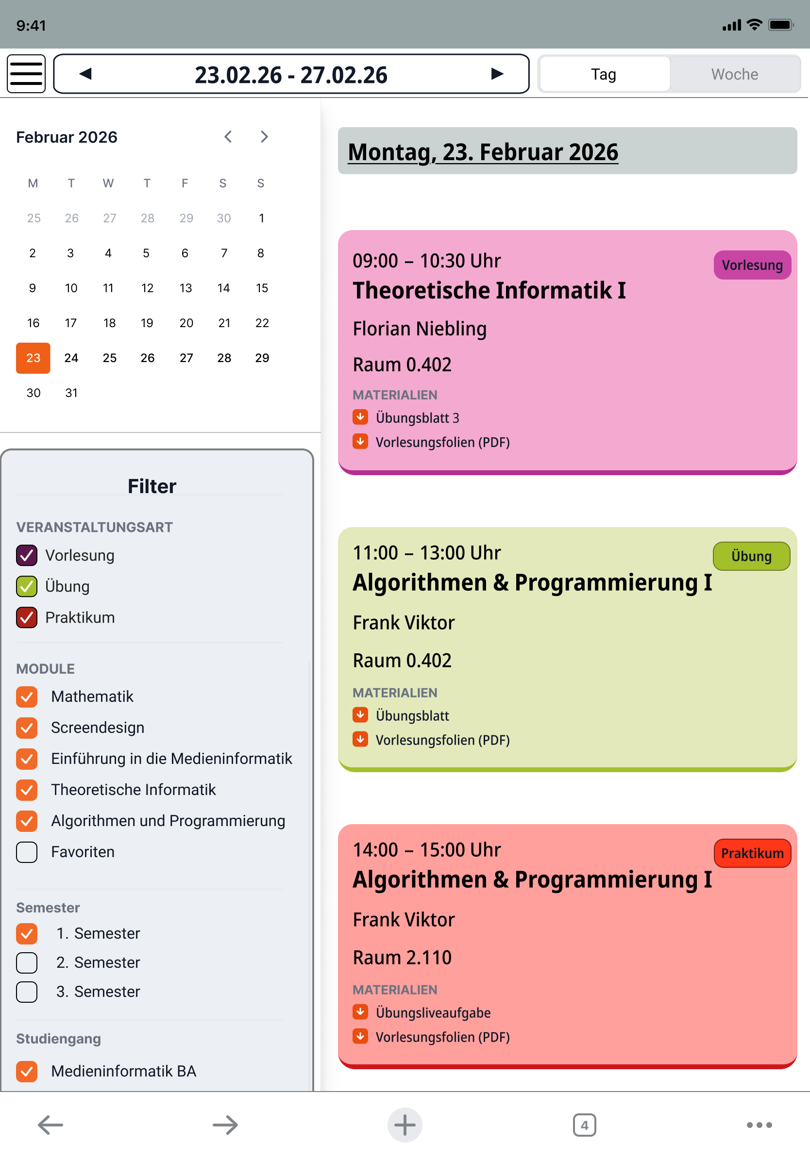 Insgesamt basiert das Konzept auf einem klaren System aus Inhalt, Farben und einem überschaubaren Layout. Dadurch entsteht ein einheitliches Design für alle Geräte. Auch Aspekte der Barrierefreiheit wurden durch gute Kontraste und klare Schrift berücksichtigt. Das Ergebnis ist ein übersichtliches Interface, das Studierenden den Alltag erleichtert und die Planung ihrer Veranstaltungen unterstützt.