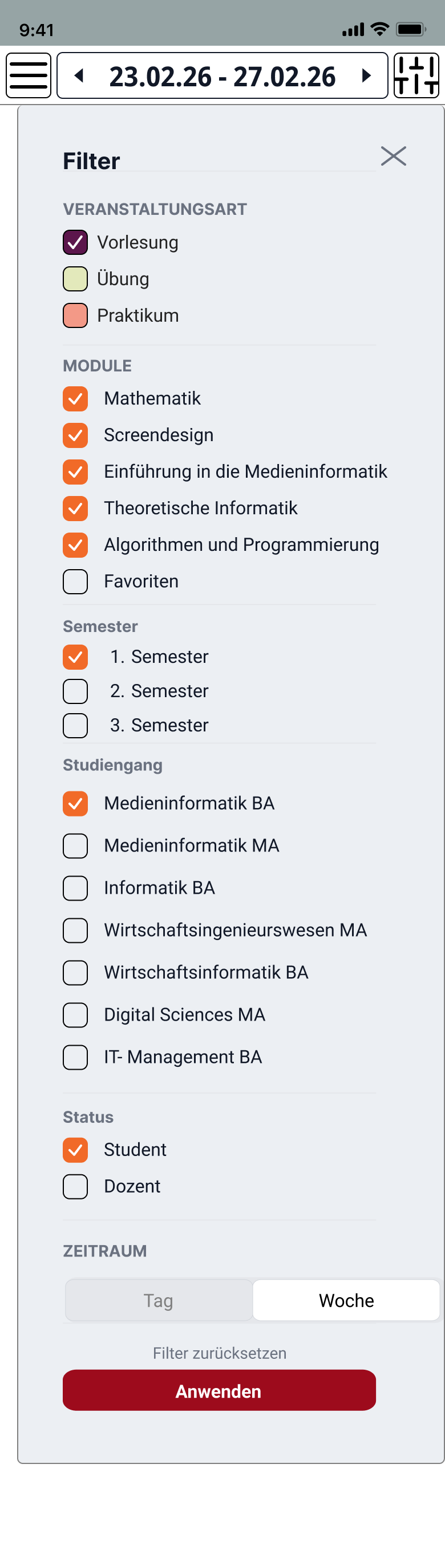 Zu Beginn stand die Ideenfindung mithilfe von Personas. Diese stellten unterschiedliche Nutzergruppen dar und rechtfertigten dabei die verschiedenen Geräteklassen. Die wichtigste Zielgruppe waren die Studierende, da diese häufig mobil auf ihren Stundenplan zugreifen. Wichtige Bedürfnisse waren eine schnelle Übersicht über Veranstaltungen, genauere Infos zu einzelnen Modulen sowie Zugriff auf Profil, Einstellungen und Benachrichtigungen. Auch die Möglichkeit, Räume einzusehen und spontane Ausfälle mitzubekommen, spielte eine große Rolle. Zusätzlich sollte eine Filterfunktion eingebaut werden, damit der Screen nicht zu überladen wirkt und individuell angepasst werden kann.