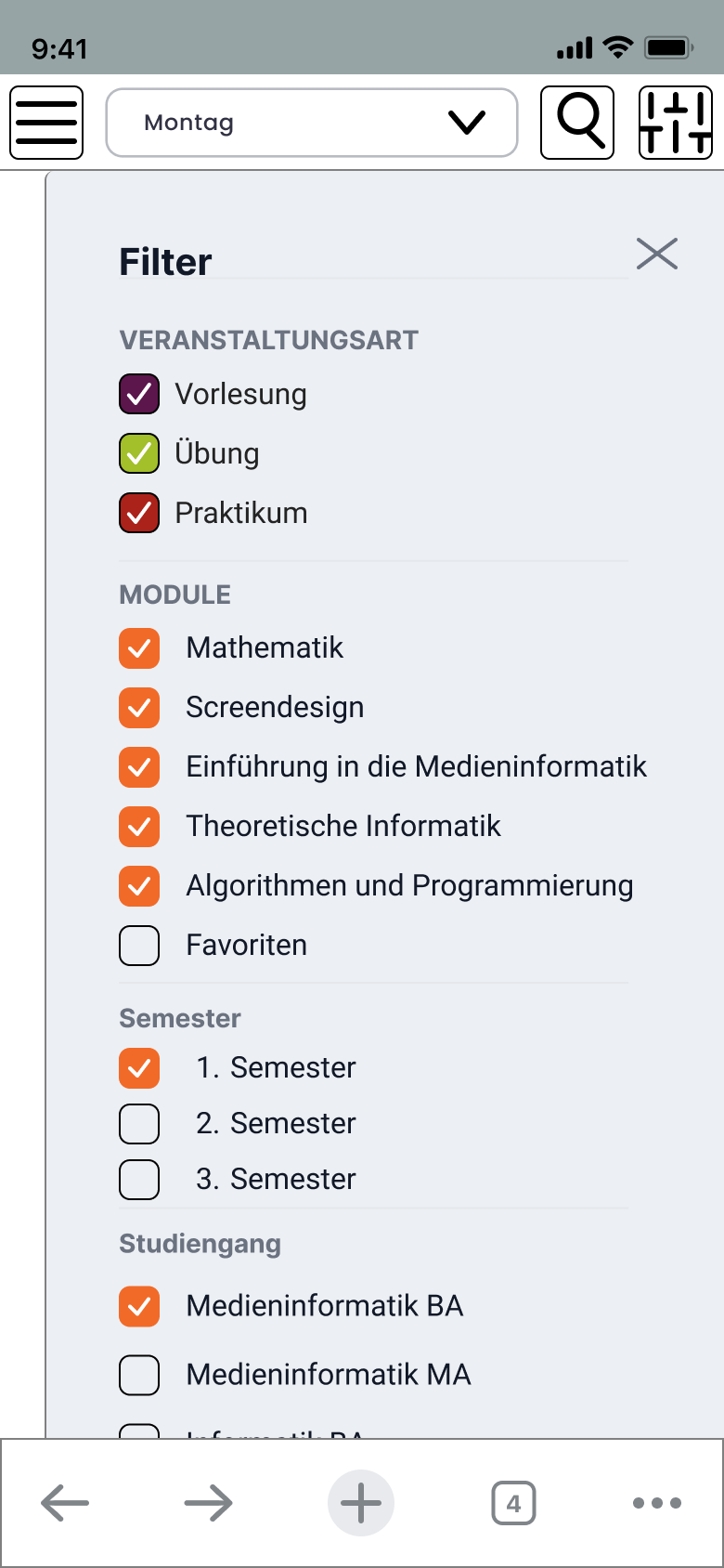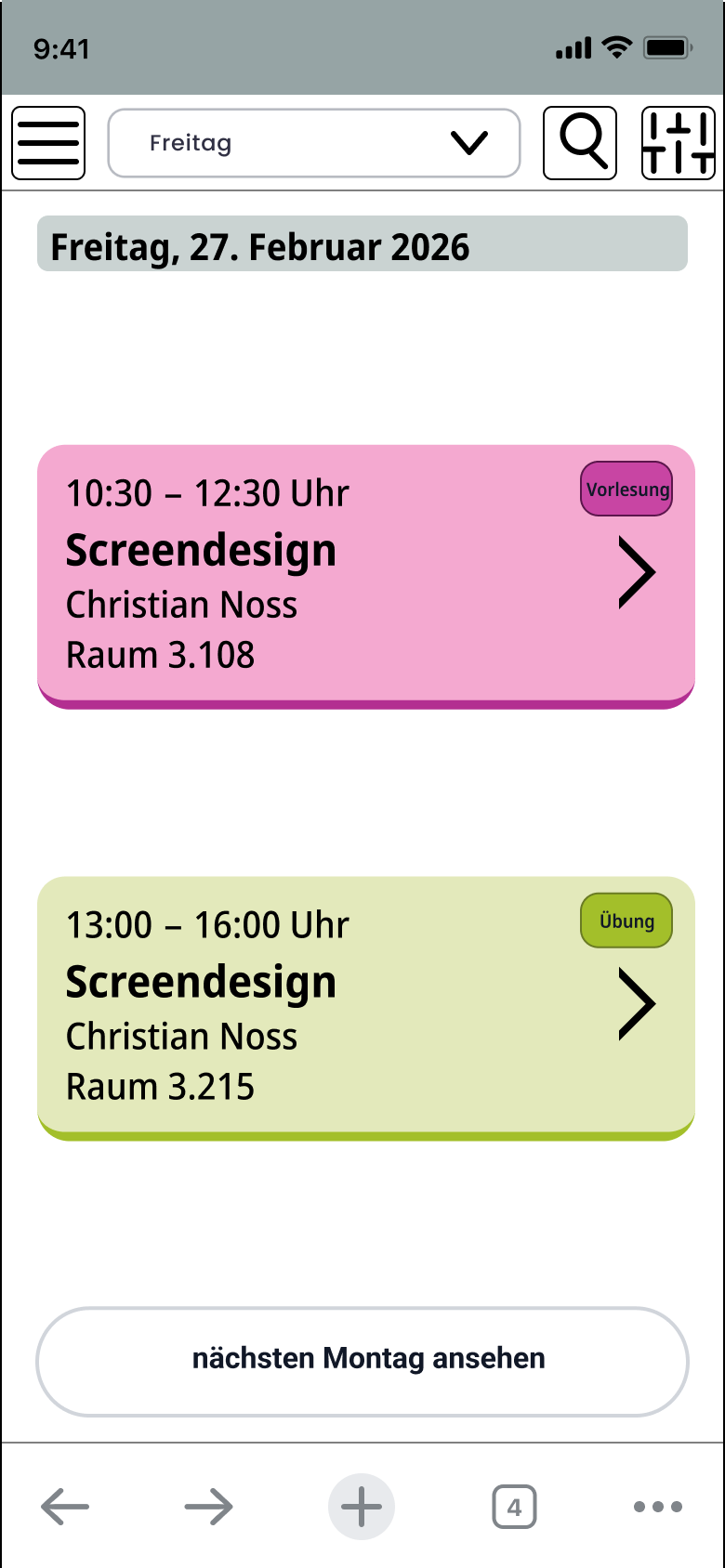 Auf Grundlage dieser Anforderungen wurden verschiedene Screens entwickelt, vor allem für mobile Geräte, da diese im Alltag am häufigsten genutzt werden. Deshalb lag hier auch der größte Fokus im Designprozess. Die Desktopansicht wurde eher an die Bedürfnisse von Dozierenden angepasst, bei denen eine eher funktionsfähige und übersichtliche Darstellung im Vordergrund steht. Dafür wurde ein Spaltenraster verwendet, das mehrere Veranstaltungen gleichzeitig sichtbar macht und zusätzliche Elemente wie eine seitliche Filterleiste etabliert. Zur Unterscheidung der zwei verschiedenen Stakeholder sollen die Dozenten in der Lage sein, nach dem Login unter „Einstellungen“ einen Raum zu reservieren und zudem bei kurzfristigen Ausfällen unter „Orga“ eine Mitteilung zu geben, die die Studenten per Nachricht informiert.