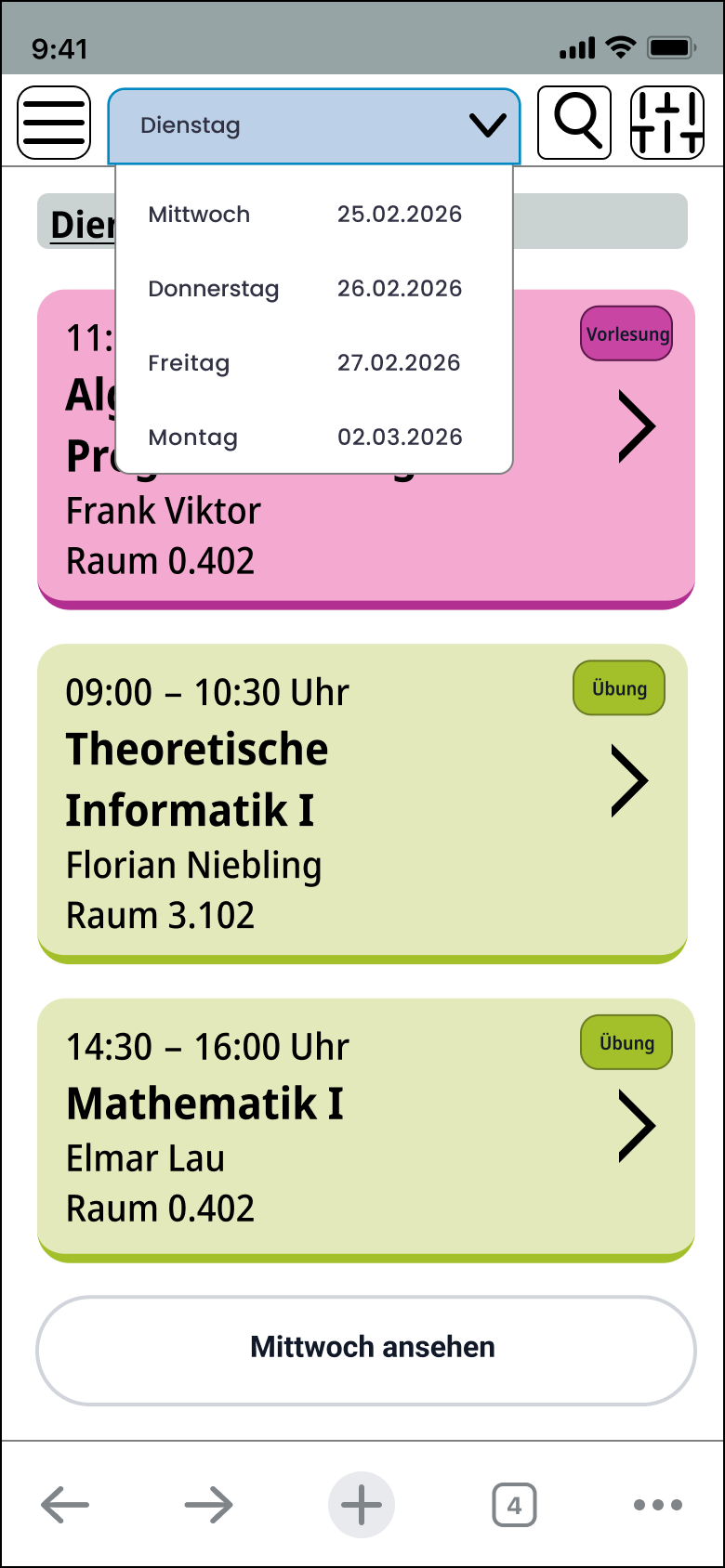Ein wichtiges Konzept für kleinere Geräte war eine Searchbar in Form eines Dropdowns, mit der man schnell zwischen Tagen wechseln kann. Diese Idee wurde später für die zwei anderen Geräteklassen durch einen interaktiven Kalender ersetzt, da diese Idee schon irgendwie Elemente, die nur aus designischen Gründen gezeigt werden, einen Nutzen gibt. Für jede Geräteklasse wurden sowohl Wochen- als auch Tagesansichten gestaltet, die sich je nach Größe und Nutzung unterscheiden.