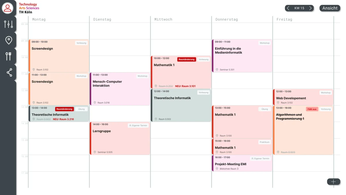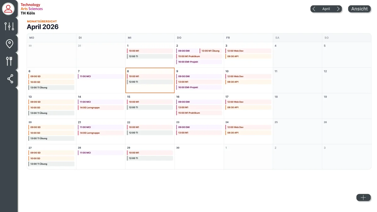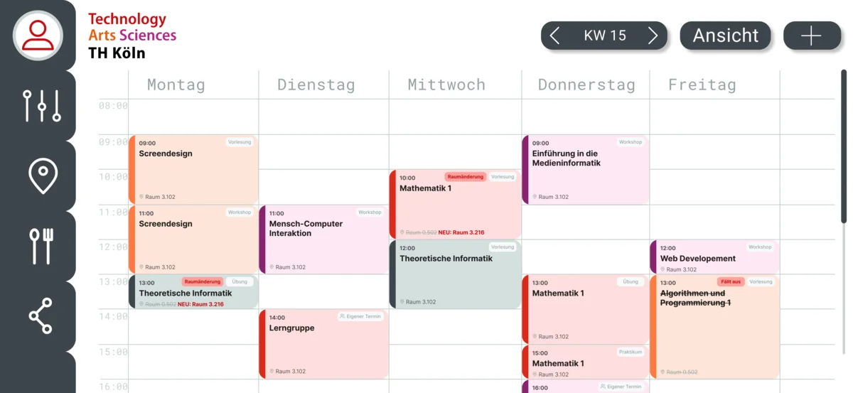 Das Konzept orientiert sich am Corporate Design der TH Köln. Die gezielte Verwendung von Farbnuancen in Rot, Orange, Lila und Schwarz spiegelt nicht nur die Identität der Hochschule wider, sondern dient auch zur Unterscheidung von Terminen. Die serifenlose Schrift „Inter“ sowie eine linksbündige Ausrichtung unterstützen den Anspruch an die Barrierefreiheit, da sie eine hohe Lesbarkeit auf unterschiedlichen Geräten haben und leichter zu erfassen sind. Die Einbindung einer hervorgehobenen Seitenleiste ermöglicht eine einfache Navigation. Die Seitenleiste sowie die verschiedenen Buttons sind durch Schatten hervorgehoben und tragen zu einer einheitlichen Lesbarkeit bei. Durch verschiedene Designaspekte wie die Nutzung von Symbolen, die Verwendung von Hell-Dunkel Kontrasten und gleichbleibenden Elementen wird eine lesbare und barrierefreie Nutzung des Systems ermöglicht.