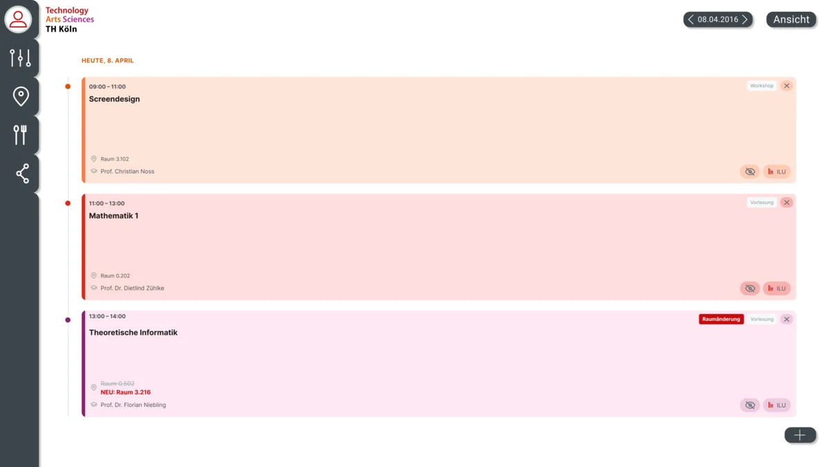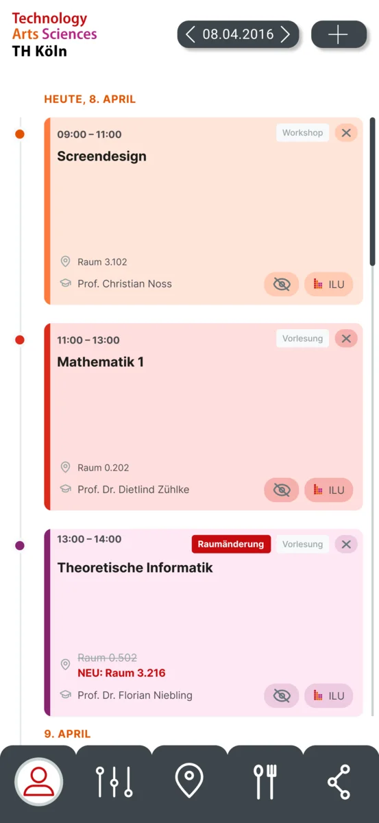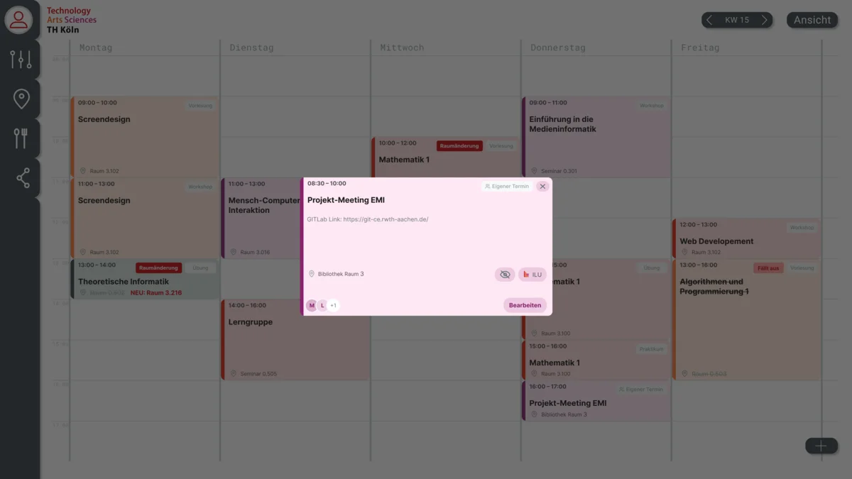 Ein zentraler Leitgedanke des Entwurfs ist die Individualisierung, da Studienverläufe stark variieren. Anstelle der ständigen Einstellung der Filter, welche nicht gespeichert werden und dazu noch unwichtige Vorlesungen und Übungen anzeigen, basiert das System auf den im ILU abonnierten Kursen. Um den Stundenplan zu einem persönlichen Werkzeug zu machen, wurde eine Funktion zum Hinzufügen von eigenen Terminen, Buchen von Räumen und das Ein- und Ausblenden einzelner Termine integriert. Zusätzlich ermöglichen direkte Verlinkungen zu den jeweiligen ILU-Seiten innerhalb der Terminansicht eine einfache Navigation ohne Umwege.