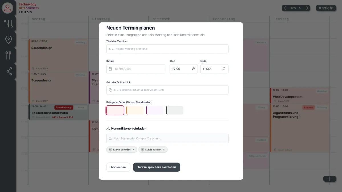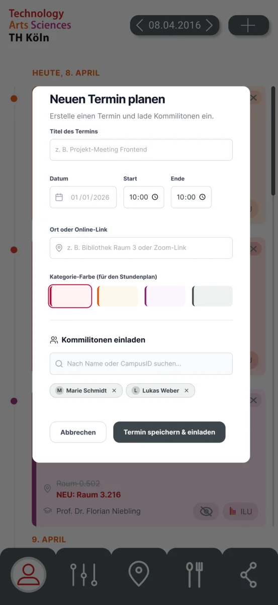 Da ein erfolgreiches Studium von der Zusammenarbeit der Studenten geprägt ist, werden soziale Organisationsmöglichkeiten direkt im Stundenplan angezeigt. Die Möglichkeit, eigene Termine wie Lerngruppen zu erstellen und Kommilitonen per Suche einzuladen, bindet die Planung von eigenen Terminen mit in die Veranstaltungsübersicht ein und reduziert den Wechsel zwischen verschiedenen Anwendungen. Zudem wird der Umgang mit unvorhergesehenen Ereignissen berücksichtigt. Raumänderungen und Ausfälle werden auffällig durch farbliche Badges hervorgehoben, um Fehler zu vermeiden.