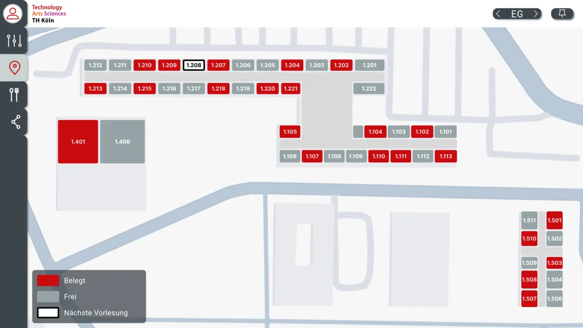 Zur Vereinfachung der Orientierung auf dem Campus wurde ein Gebäudeplan konzipiert. Die farbliche Differenzierung zwischen freien, belegten und für den Stundenplan relevanten Räumen ermöglicht eine schnellere Nutzung.