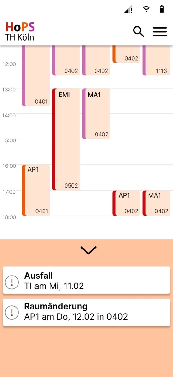 In Anlehnung an das Gesetz der Nähe wurden essenzielle Daten, wie Modulkürzel und Raumnummer in der Standardansicht als kompakte Kachel gruppiert. Erst durch eine Klick-Interaktion erweitern sich die Karten und stellen detaillierte Modulinformationen, Dozierende und ECTS-Punkte dar, damit das Interface übersichtlich bleibt und nicht überladen wirkt. Die Verwendung von ausfahrbaren Kacheln folgt dem Ziel, die Navigationstiefe zu minimieren. Anstatt den Nutzer auf eine neue Unterseite zu führen, bleiben die Details im aktuellen Sichtfeld. Der bewusste Einsatz von Weißraum zwischen den Kacheln sorgt dafür, dass die einzelnen Veranstaltungen voneinander abgegrenzt werden. Um unterschiedliche Veranstaltungstypen zu kennzeichnen, sind die Kacheln nach Vorlesungen, Übungen und sonstigen Terminen farblich kodiert. Dies ermöglicht es den Nutzern, die Struktur ihrer Woche zu erfassen, noch bevor sie die textlichen Inhalte der einzelnen Kacheln gelesen haben. Ein Benachrichtigungspanel, welches über eine Swipe-Up-Geste aufgerufen wird, informiert den Nutzenden unmittelbar über kurzfristige Änderungen, ohne das Interface dabei visuell zu überladen. Da wichtige Statusveränderungen oft schnell erfasst werden müssen, erlaubt diese Geste einen intuitiven Zugriff, ohne die Griffposition verändern zu müssen und optimiert die Einhandbedienung.