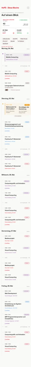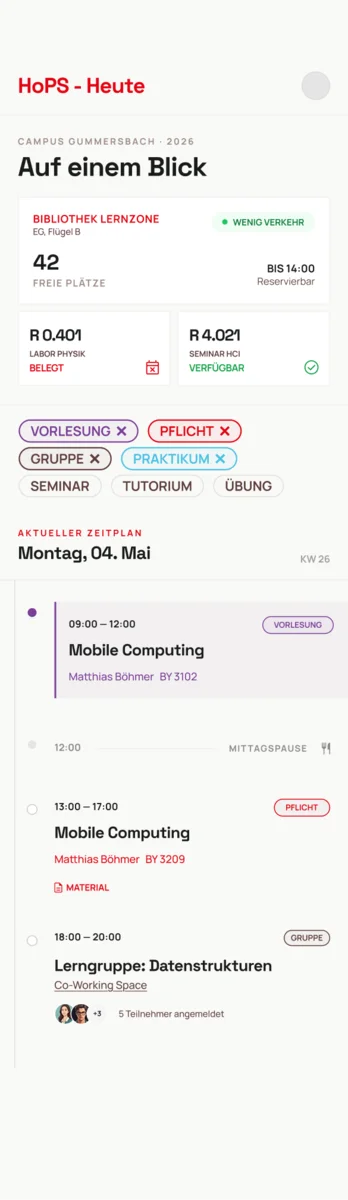 Das Redesign gliedert sich in zwei zentrale Ansichten: „Heute” und „Diese Woche”. Die Logik dahinter ist so naheliegend wie effektiv. Was mich jetzt gerade interessiert, sehe ich sofort. Was mich morgen oder übermorgen interessiert, ist einen Tap entfernt. Kein verschachteltes Menü, keine überladene Kalenderansicht, die mehr Rätsel aufwirft als löst. Die „Heute”-Ansicht ist die wichtigste Seite der gesamten App. Sie zeigt auf einen Blick: Welche Veranstaltungen liegen an, welche ist gerade aktiv, was kommt als nächstes. Dazu kommt die Raumübersicht mit Echtzeit-Auslastung der Bibliothek und der Seminarräume ein Feature, das in der alten Version komplett fehlte, aber im Campusalltag enormen Mehrwert hat. Ein Detail, das kaum Platz braucht aber den Alltag spürbar erleichtert.