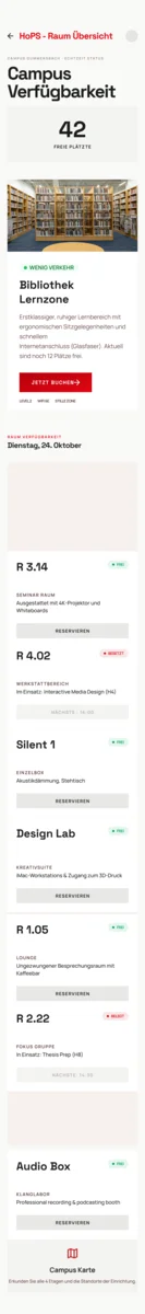 Was visuell sofort auffällt: Die Farbsprache ist bewusst reduziert und gezielt eingesetzt. Ein kräftiges Rot als Akzentfarbe, viel Weiß, klare Typografie. Kurstypen werden mit kleinen Labels gekennzeichnet Pflicht, Seminar, Vorlesung, Gruppe. Das hilft, den Tag auf einem Scan zu erfassen, ohne jeden Eintrag einzeln lesen zu müssen. Die aktive Veranstaltung wird deutlich hervorgehoben, der Rest tritt ruhig in den Hintergrund. Priorität durch Kontrast statt durch Beschriftung.Die „Diese Woche”-Ansicht funktioniert nach derselben Logik, aber mit etwas mehr Überblick. Wochentage sind klar unterteilt, Veranstaltungen chronologisch sortiert. Oben bleibt die Raumübersicht erhalten auch hier sieht man auf einen Blick, wo noch Plätze frei sind. Ein Filtermechanismus erlaubt es, den Stundenplan nach Veranstaltungstyp zu filtern: Vorlesung, Übung, Praktikum, Seminar, Tutorium oder Pflicht je nachdem, worauf man gerade den Fokus legen möchte. Die aktive Veranstaltung wird auch hier klar rot hervorgehoben.