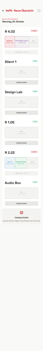 Die Navigation der App erfolgt über eine Bottom Navigation Bar mit fünf Icons: Stundenplan, Übersicht, Räume, Gemerkte und Profil. Das aktive Element wird durch ein rotes, abgerundetes Highlight eindeutig gekennzeichnet – der Nutzer weiß jederzeit wo er sich befindet, ohne groß nachdenken zu müssen. Das zentrale Ziel des Redesigns war Effizienz. Studierende sollen nicht lange suchen müssen alle relevanten Informationen auf einen Blick, ohne durch mehrere Seiten navigieren zu müssen. Stundenplan, Raumauslastung, aktuelle Veranstaltung alles auf einer Oberfläche, sofort erfassbar. Gleichzeitig sollte die Ansicht nicht starr wirken. Über eine Filterfunktion kann jeder Nutzer selbst entscheiden, welche Veranstaltungstypen angezeigt werden wer nur seine Pflichtveranstaltungen sehen will, blendet den Rest einfach aus. Die App passt sich dem Nutzer an, nicht umgekehrt.