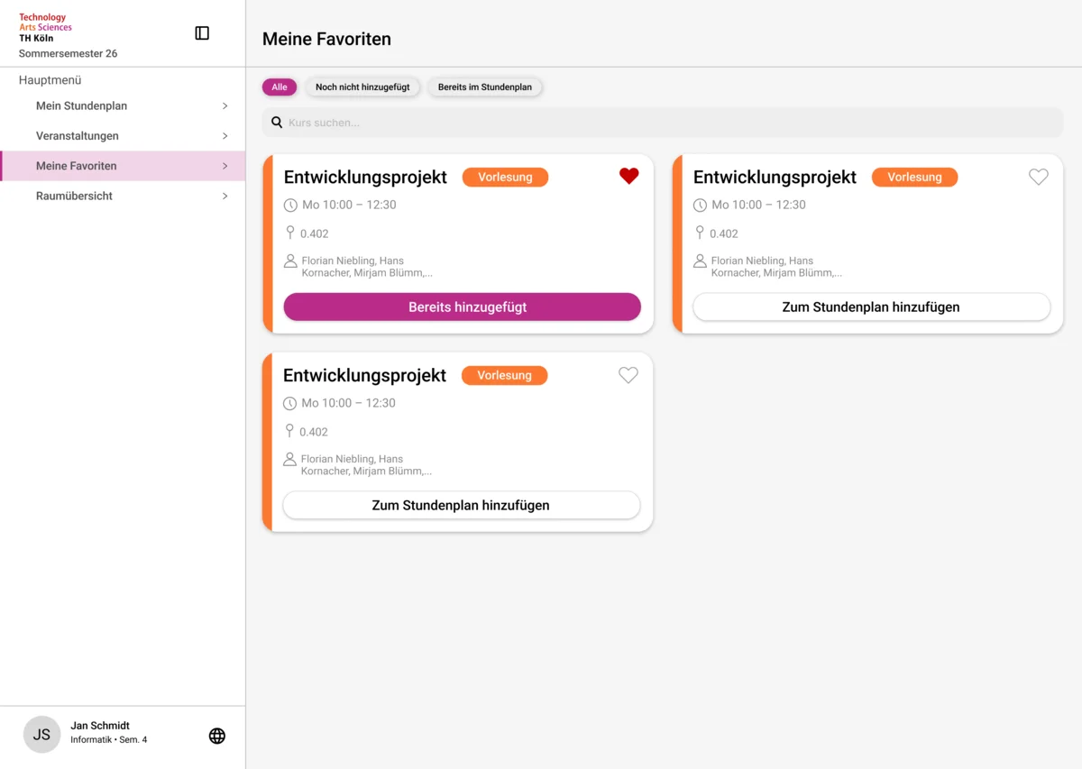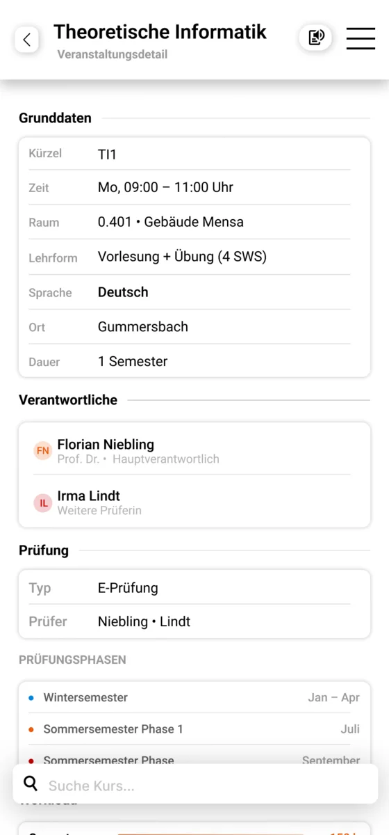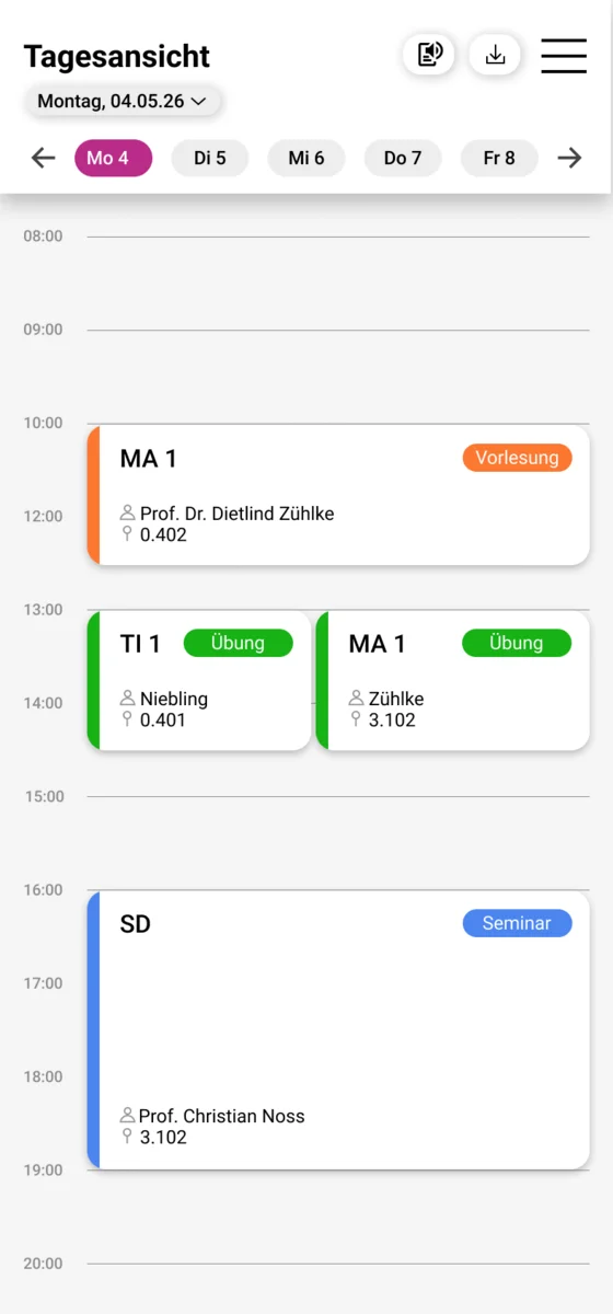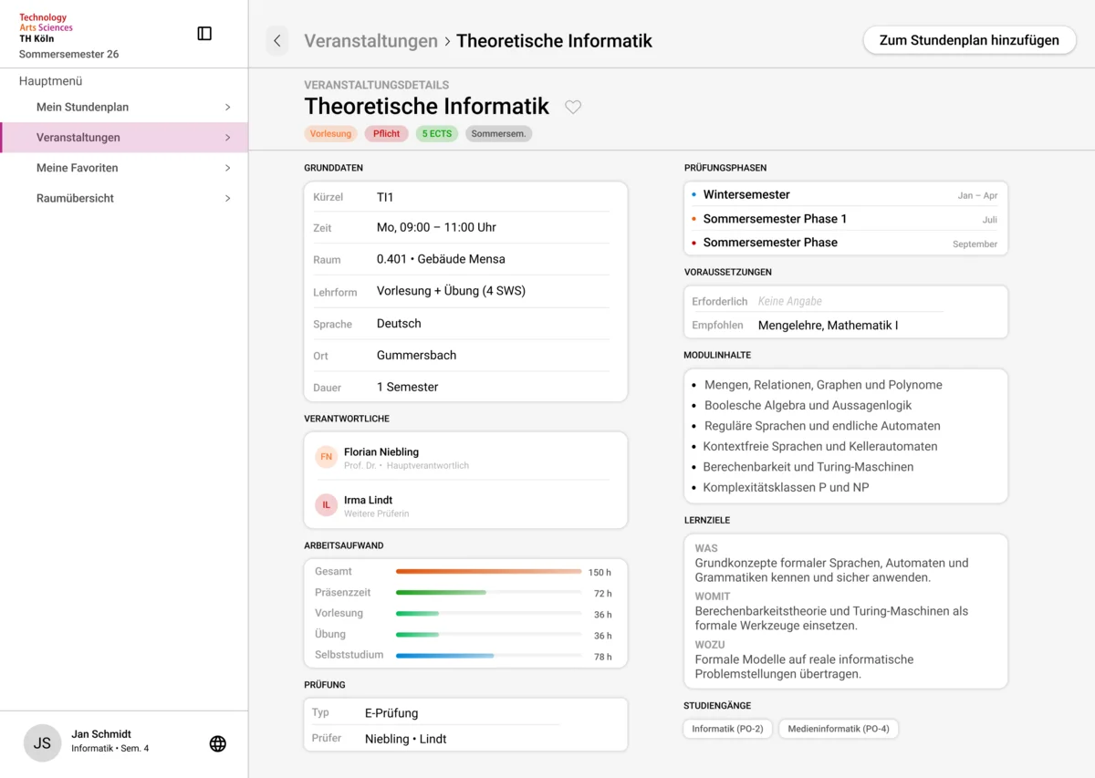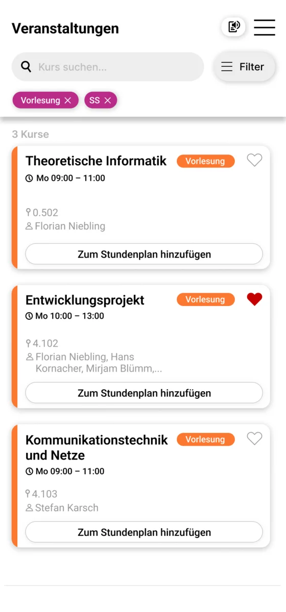 Die Möglichkeit, Veranstaltungen individuell auszuwählen und in einen eigenen Stundenplan zu integrieren, reduziert die Komplexität der Darstellung erheblich. Die mobile Nutzung wurde deutlich verbessert, da Inhalte vollständig sichtbar und intuitiv navigierbar sind.