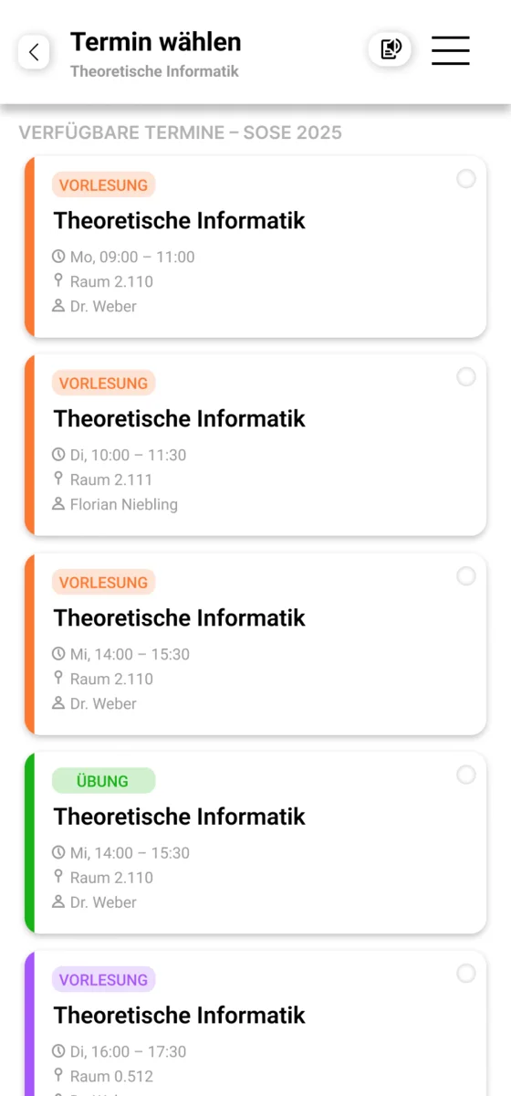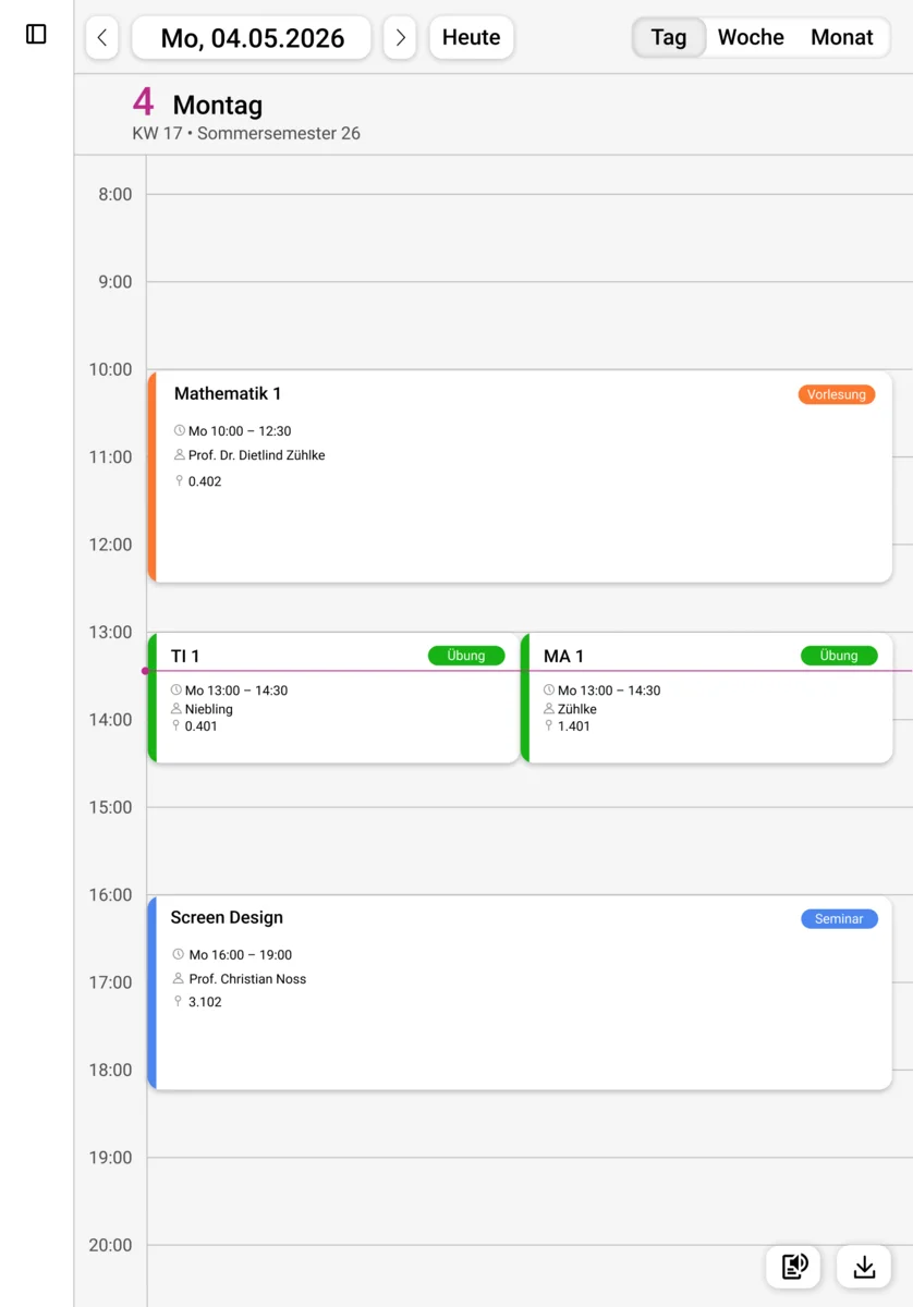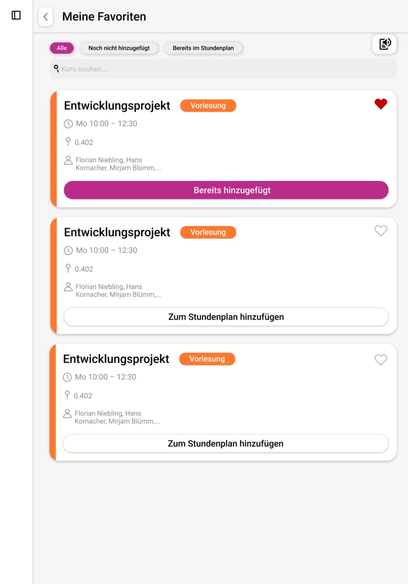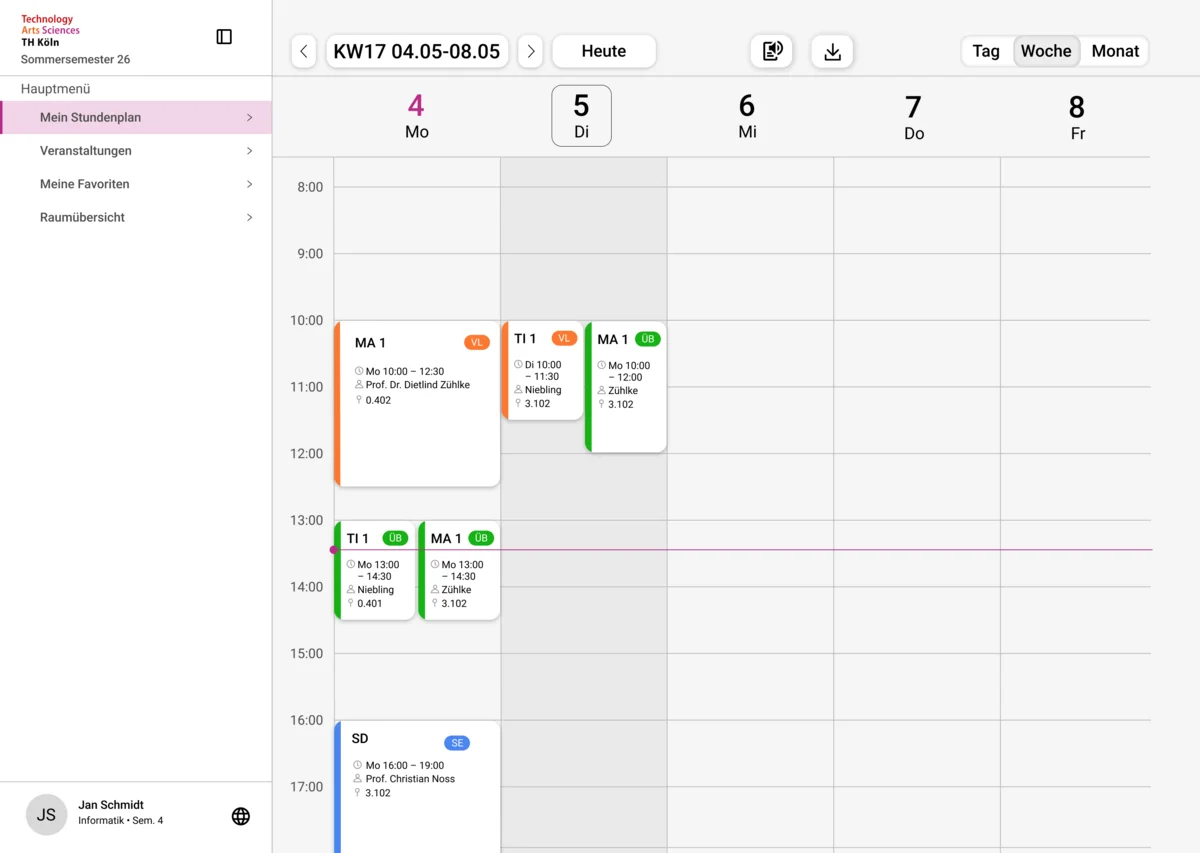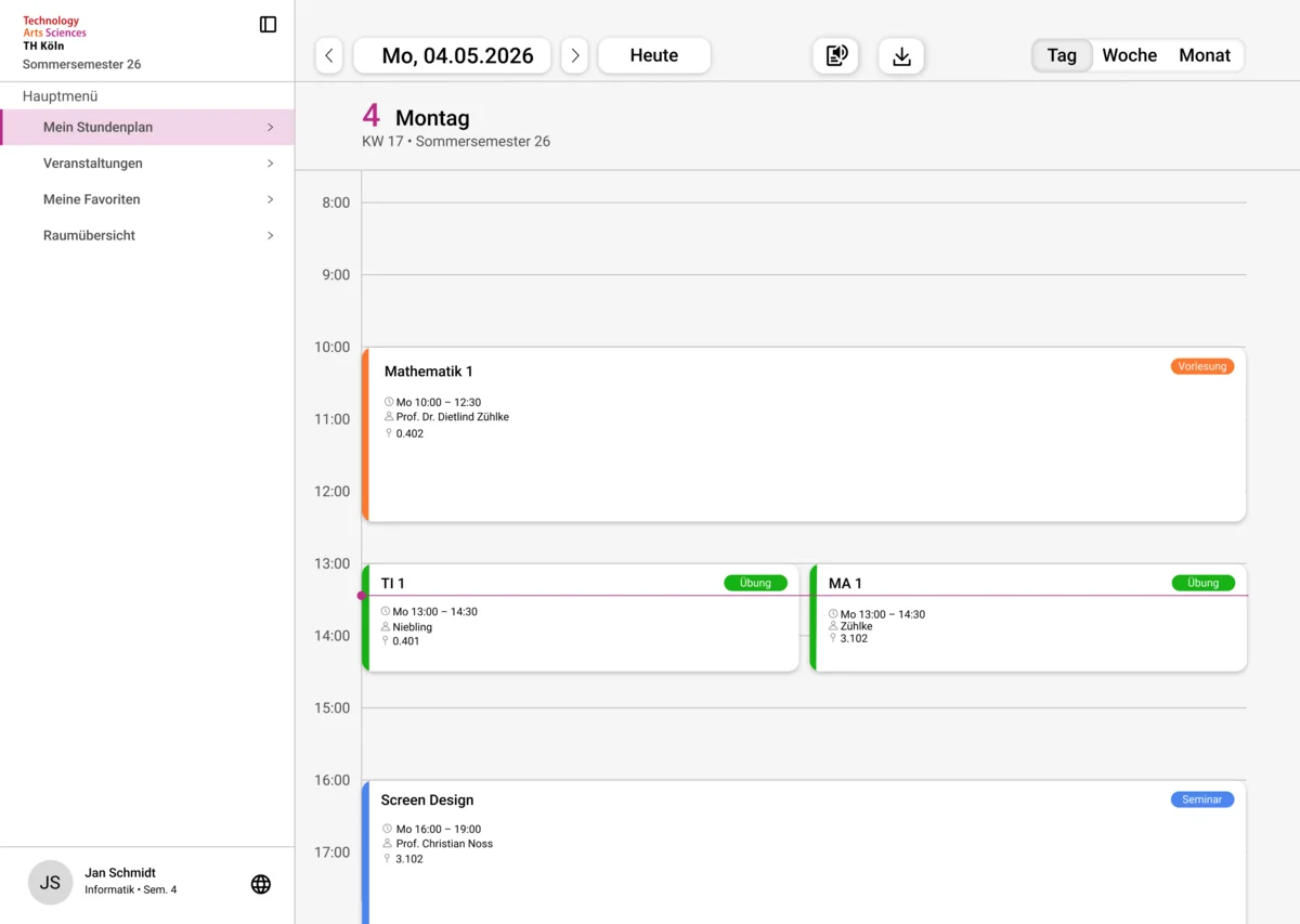 Die Möglichkeit, Veranstaltungen individuell auszuwählen und in einen eigenen Stundenplan zu integrieren, reduziert die Komplexität der Darstellung erheblich. Die mobile Nutzung wurde deutlich verbessert, da Inhalte vollständig sichtbar und intuitiv navigierbar sind.