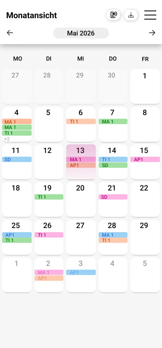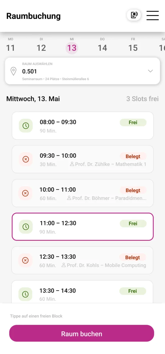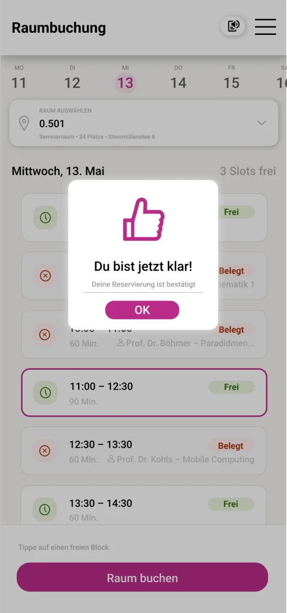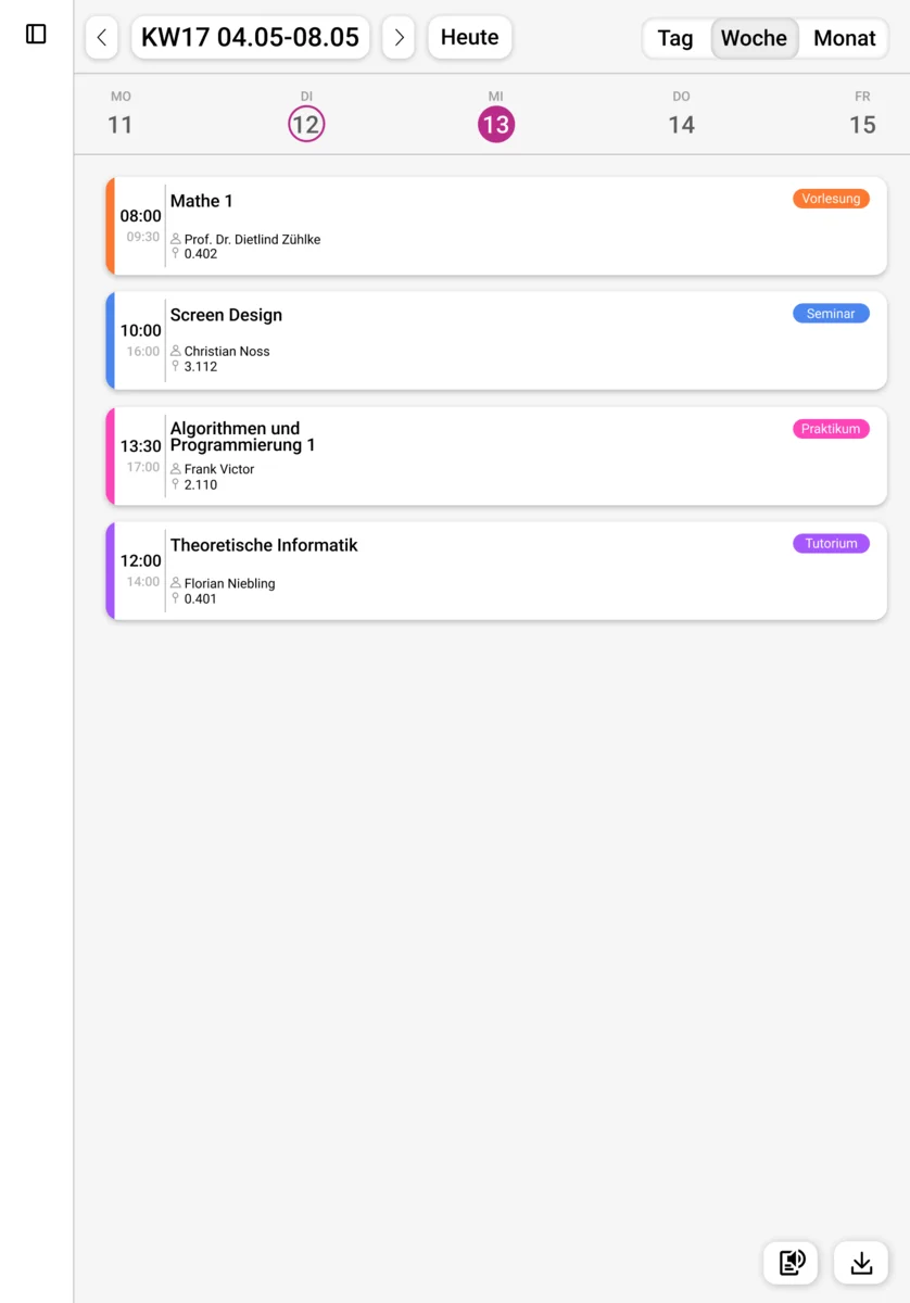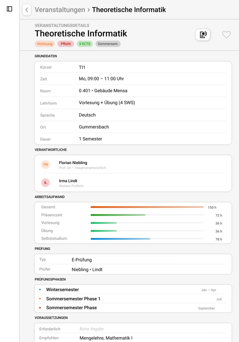 Die Möglichkeit, Veranstaltungen individuell auszuwählen und in einen eigenen Stundenplan zu integrieren, reduziert die Komplexität der Darstellung erheblich. Die mobile Nutzung wurde deutlich verbessert, da Inhalte vollständig sichtbar und intuitiv navigierbar sind.
