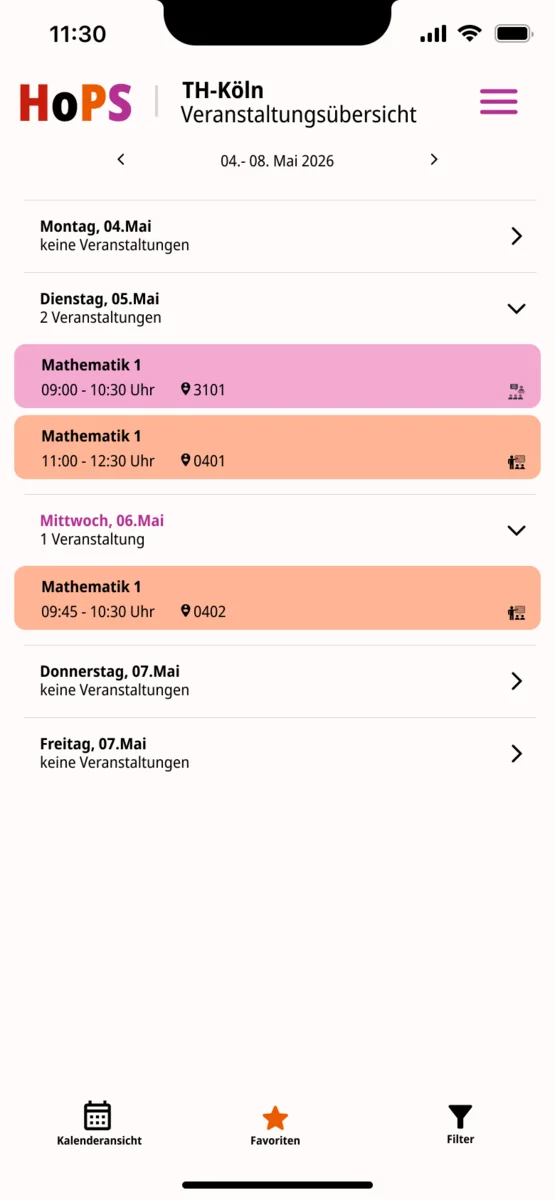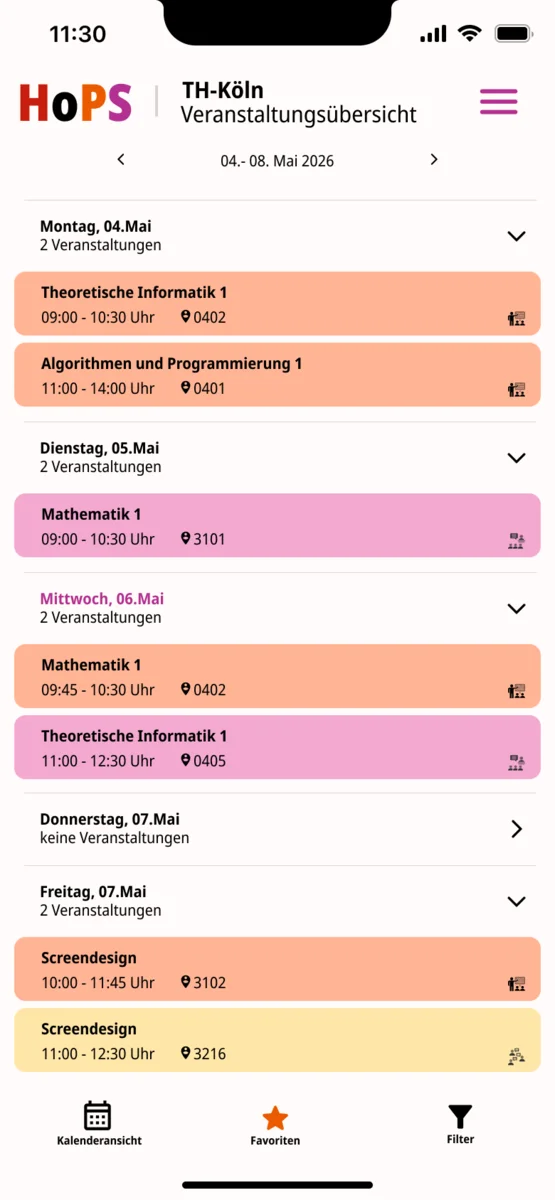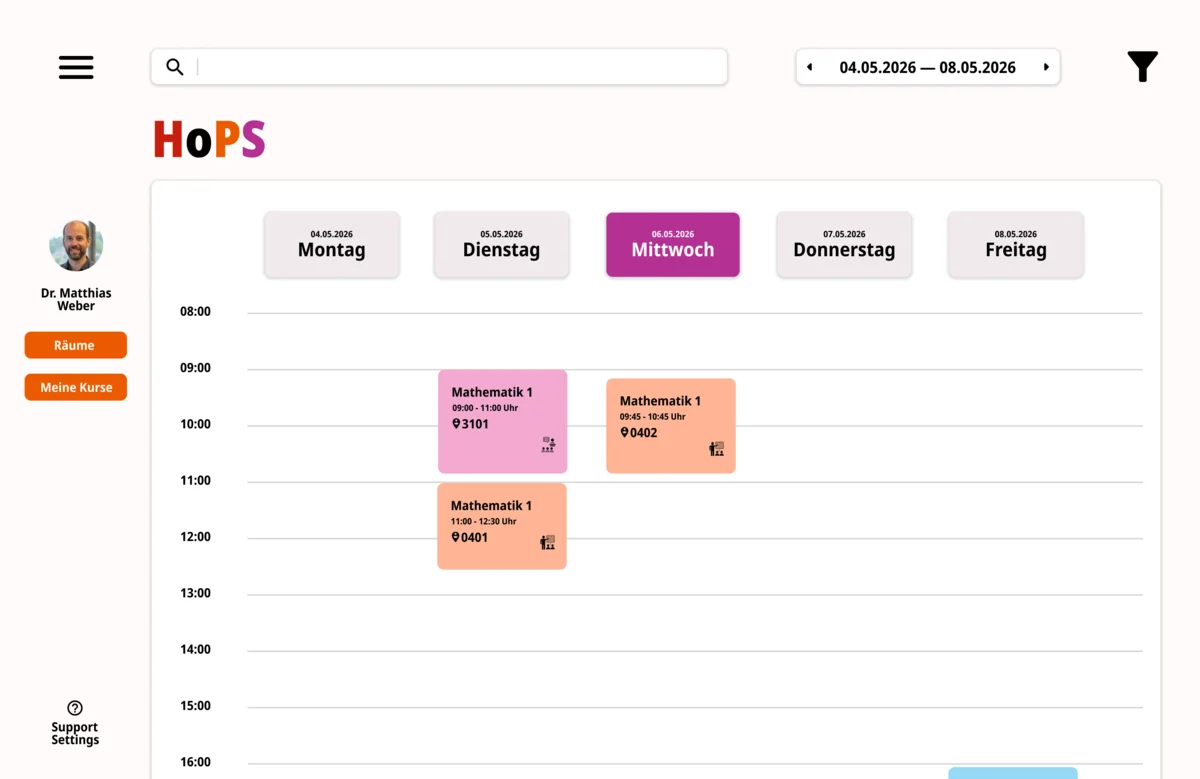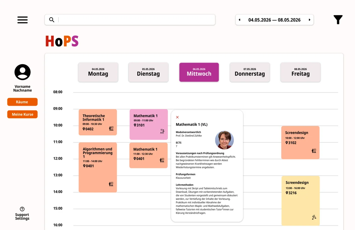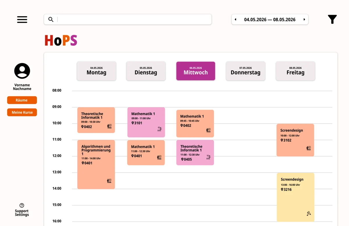 Durch ein konsistentes Farbsystem und das Kachelprinzip wird sowohl Verständlichkeit als auch visuelle Einheitlichkeit gewährleistet. Das responsive Layout ermöglicht auf dem Desktop eine Wochenansicht und auf mobilen Geräten eine optimierte Tages- bzw. Listenansicht, wodurch eine geräteübergreifende Nutzung sichergestellt wird. Aspekte der Barrierefreiheit wurden durch hohe Farbkontraste, klare Typografie sowie die Kombination aus Icons und Text berücksichtigt. Visuell bleibt das Interface an das Erscheinungsbild der TH Köln angelehnt, entwickelt jedoch durch die Verwendung von Orange und Violett eine eigenständige HoPS-Identität. Die unterschiedlichen Anforderungen der Nutzergruppen, von der Kursorganisation für Studierende bis zur Raumverwaltung für Lehrende und Mitarbeitende, werden durch spezifische Ansichten und Filterlogiken adressiert. Das Ergebnis ist ein durchgängiges Design, das Studierende im Alltag entlastet und die Planung ihrer Kurse übersichtlich macht.