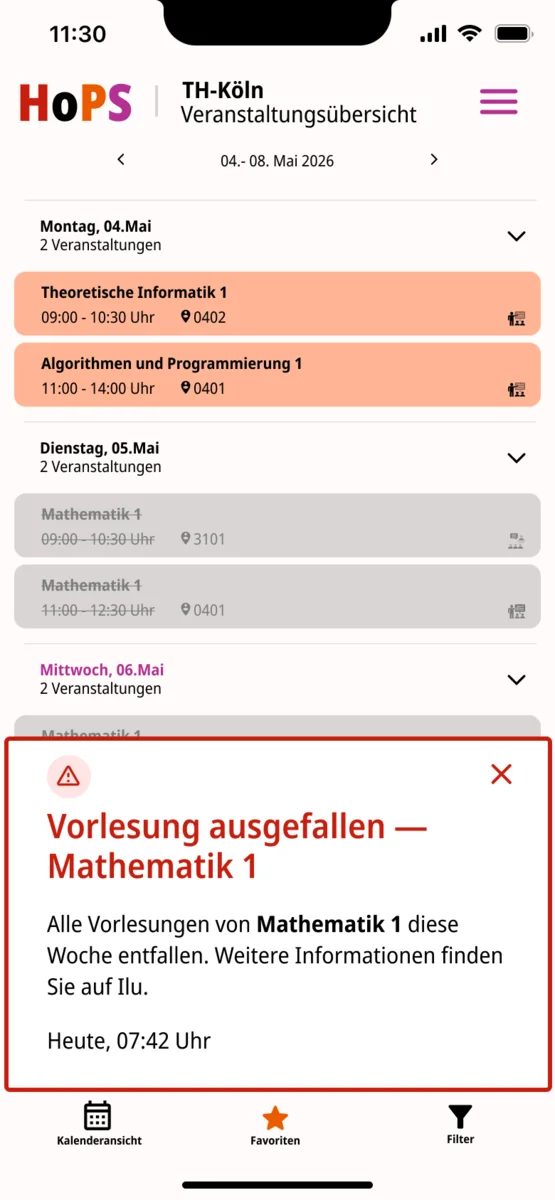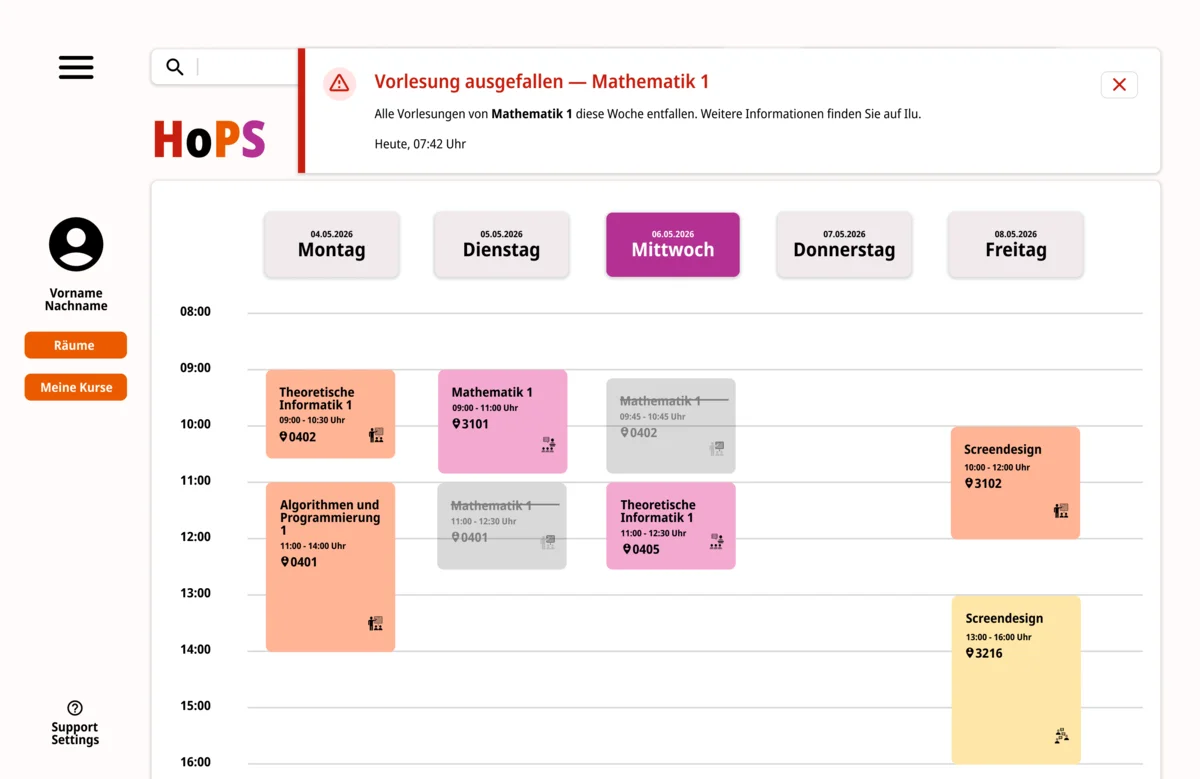 Bei Kursausfällen werden Nutzer durch einen auffälligen Hinweisbanner informiert; zusätzlich werden die entsprechenden Kacheln ausgegraut und durchgestrichen dargestellt, sodass die Information ohne weiteren Kontext verständlich ist. Das Burger-Menü bündelt Navigation, Nutzerprofil sowie weiterführende Funktionen wie Prüfungsanmeldung oder Mensaplan, wodurch zusätzliche Informationen zentral zugänglich gemacht und Zeit eingespart wird.