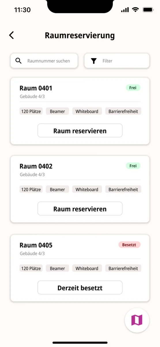 Funktionale und organisatorische Aspekte wurden ebenfalls durchdacht. Der Zugriff auf Raumreservierungen und Verfügbarkeitsinformationen ist aus Datenschutzgründen nur nach Anmeldung mit der Campus-ID möglich, ebenso wie die Einsicht in Stundenpläne von Lehrenden. In der Raumübersicht werden Räume in Form von Kacheln dargestellt, ergänzt durch Ausstattungs-Tags, Frei-/Besetzt-Status sowie Filteroptionen nach Raumtyp, Barrierefreiheit und technischer Ausstattung. Eine integrierte Gebäudeübersicht des Campus Gummersbach im oberen rechten Bereich dient als Orientierungshilfe im physischen Raum.