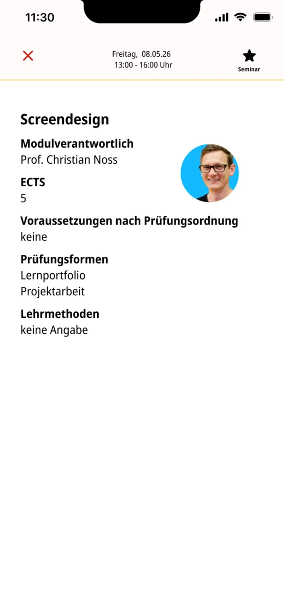 Auch ohne Login können Nutzerinnen und Nutzer auf eine allgemeine Stundenplanansicht zugreifen und verfügen, abgesehen von der Raumreservierung, über nahezu denselben Funktionsumfang wie angemeldete Personen. Um eine klare Struktur und hohe Effizienz zu gewährleisten, werden häufige Aufgaben mit möglichst wenigen Interaktionsschritten umgesetzt, etwa durch Filterfunktionen oder die Möglichkeit, über Favoriten einen personalisierten Stundenplan zu erstellen. Das Interface legt großen Wert auf Übersichtlichkeit und Klarheit: Großzügiger Weißraum reduziert die kognitive Belastung, während das Prinzip der progressiven Offenlegung Informationsüberladung vermeidet. Innerhalb der Kacheln sorgt eine dreistufige typografische Hierarchie (fetter Kurstitel, reguläre Zeitangabe, kleinere Labels) für eine schnelle Erfassbarkeit der Inhalte.