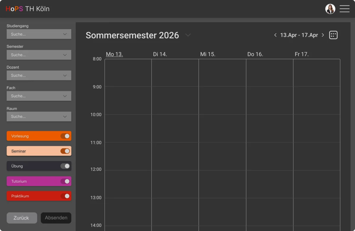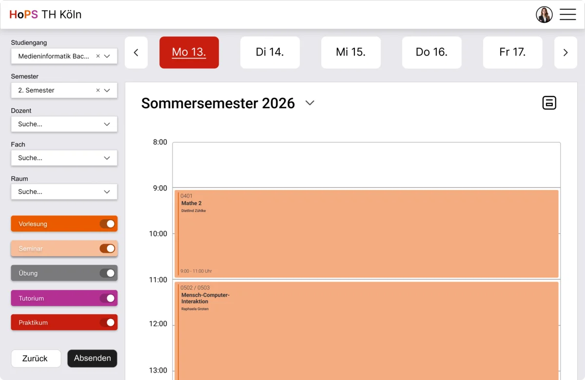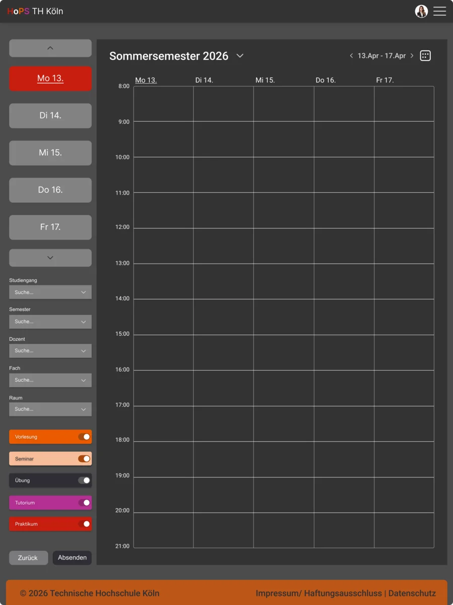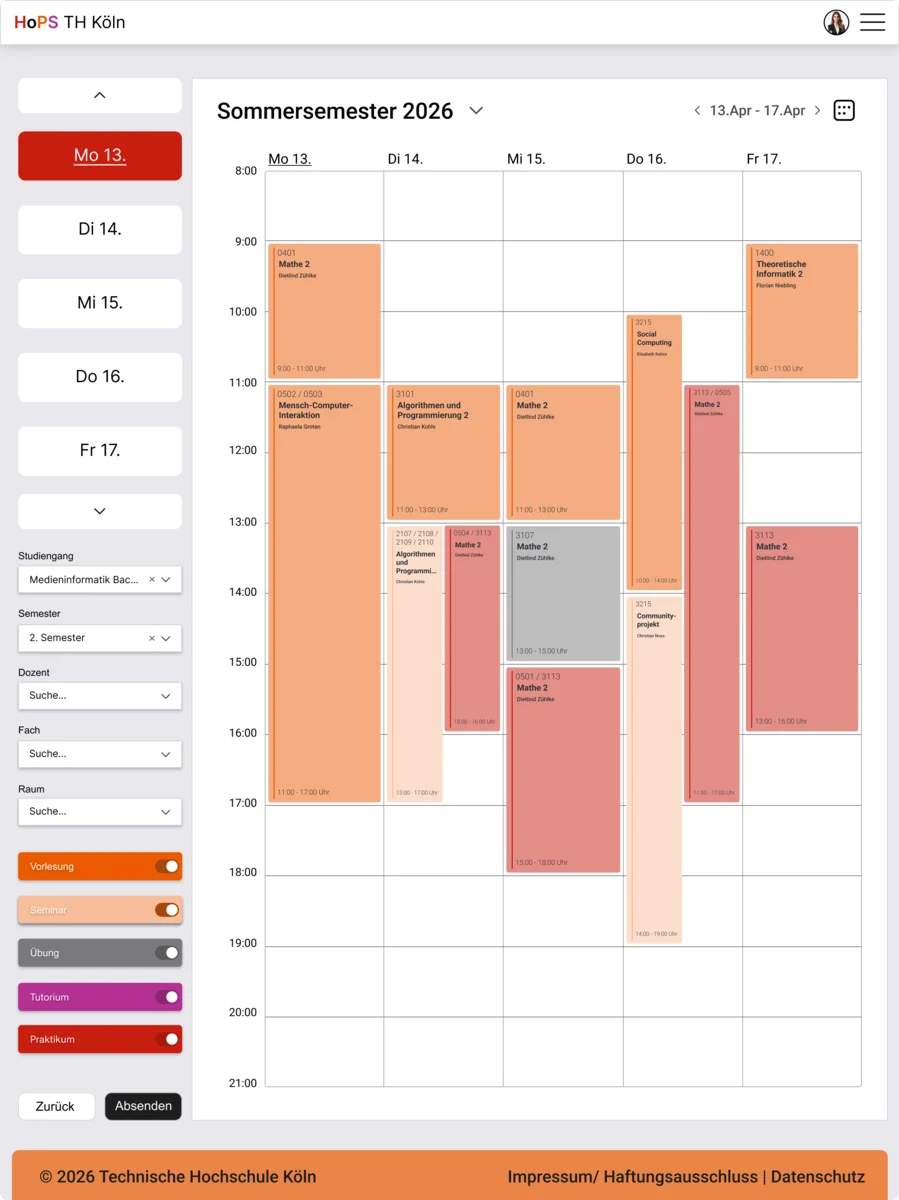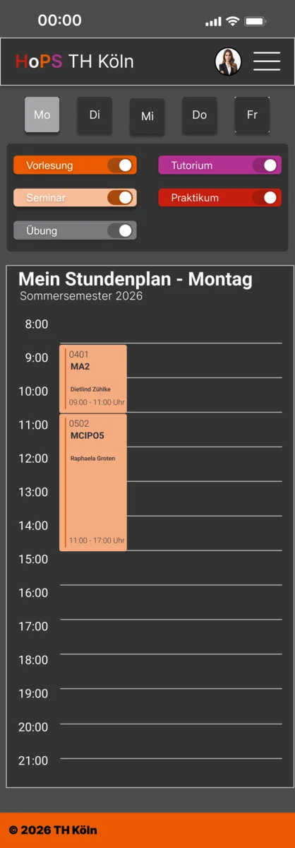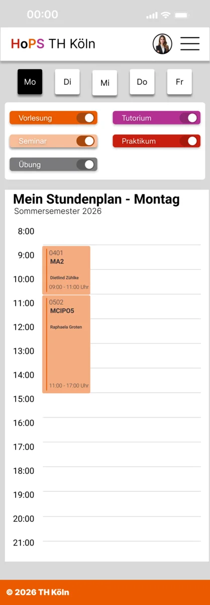 Das Grunddesign ist modern gehalten und verzichtet auf harte Linien, sowohl auf dem Desktop als auch auf der Mobilen Ebene, um das statische zu lockern, welches für ein angenehmes Gesamtbild sorgt, wobei das Farbschema der Th Köln weiterhin fortgesetzt wird. Auf der Desktop-Ansicht befindet sich eine Tagesansicht und eine Wochenansicht des Stundenplans, die beliebig gewechselt werden kann, während die Mobile Version ausschließlich aus Tagesansichten besteht. Es erlaubt dem Nutzer eine orientierte Einsicht auf den Stundenplan. Der Stundenplan wir durch das Favorisieren erstellt. Durch einen Knopfdruck auf die Vorlesung, Raumnummer etc. findet man Informationen zur Veranstaltung, dem dafür zuständigen Professor und den Raum durch das markierte Feld im Raumplan.