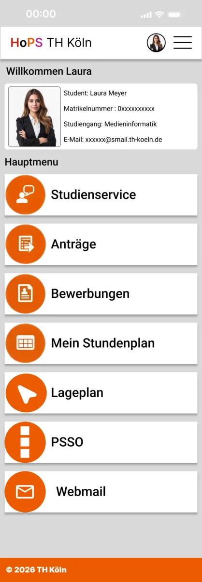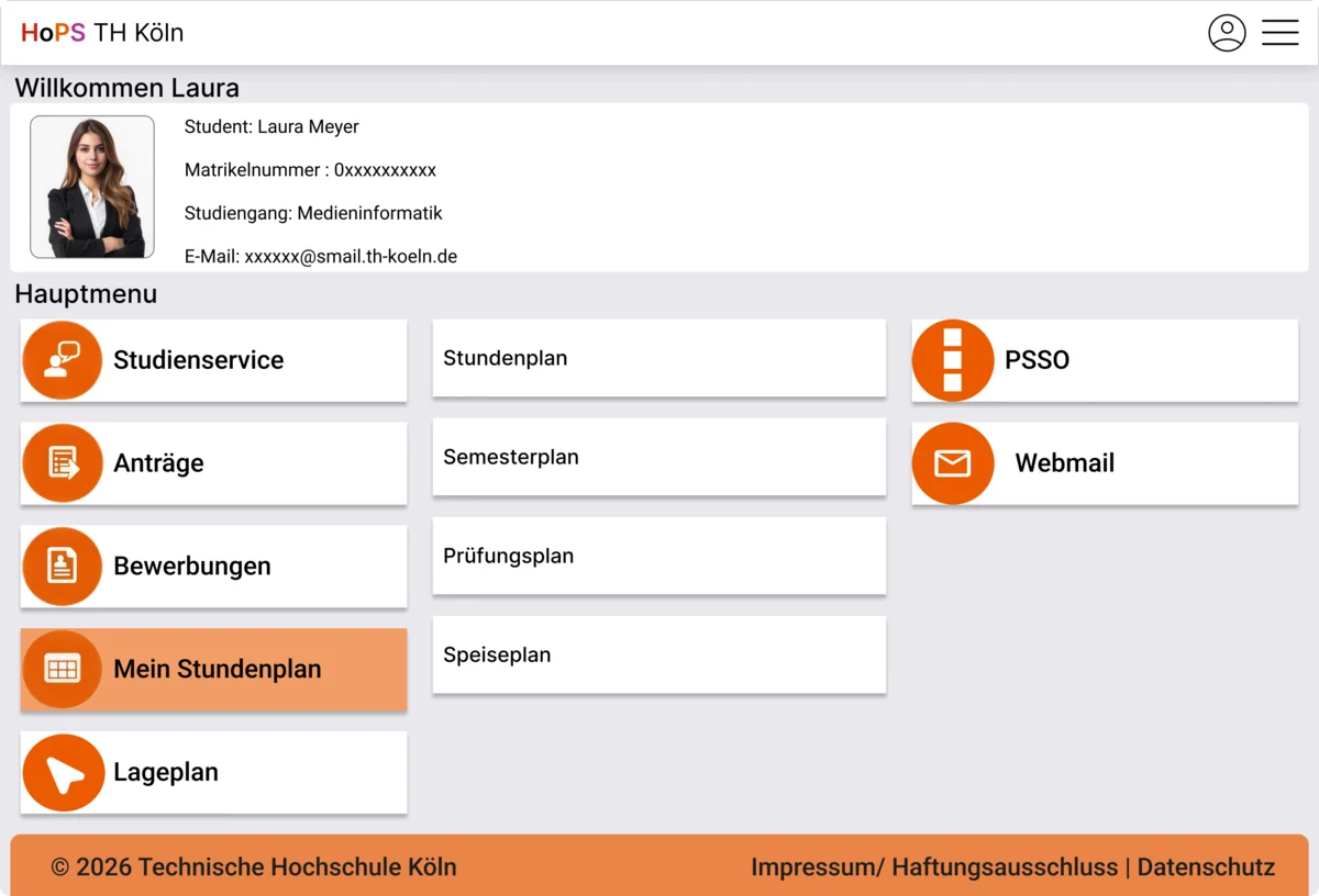 Im Profil bzw. im Hauptmenu findet man wichtige Daten zum Studierenden und eine Auswahl an verschiedenen Diensten. Dort findet man unter Studienservice, Anträge und Bewerbungen alle wichtigen Dokumente, welches das CaMS widerspiegelt. Unter „Mein Stundenplan“ findet man den persönlichen Stundenplan und andere wichtige Pläne wie zum Beispiel das Semesterplan etc., welches damit das HoPS darstellt. Ebenfalls kann man auf den Lageplan der TH Köln Gummersbach zugreifen, damit man nicht mehr auf einer externen Seite die PDF laden muss. Zudem findet man dort auch das PSSO, um sich für die Prüfungen anzumelden und ggf. den Notenspiegel aufzurufen. Zuletzt findet man dort ebenfalls die Webmail, dessen Funktion es ist E-Mails an Professoren, Tutoren oder das Sekretariat zu schicken.