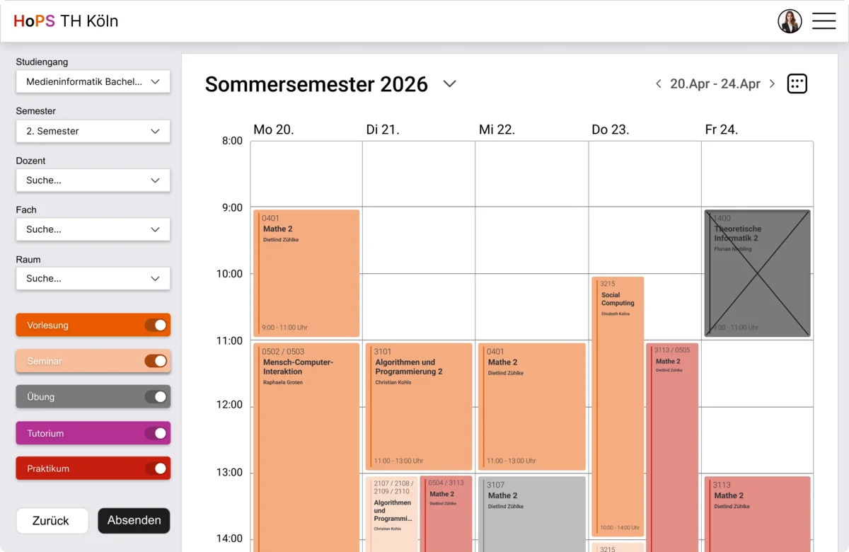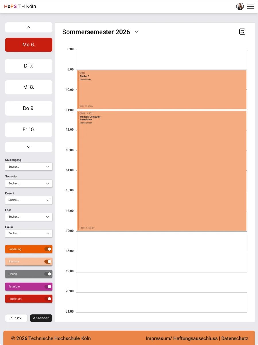 Dazu mussten die Probleme des aktuellen HoPS zusammengetragen werden, die auf eigene Erfahrungen usw. bestehen, um so Verbesserungsvorschläge zu sammeln und eventuell neue Ideen zu kreieren. Die daraus resultierenden Störpunkte des aktuellen HoPS waren zum einen, dass die Abkürzungen der Veranstaltungsnamen zu Verwirrung führen. Zudem ist es ineffizient, jedes Mal in die Legende zu schauen, um deren Bedeutung nachzuvollziehen. Veranstaltungen, die über mehrere Stunden verlaufen werden zudem kompliziert dargestellt, was zur über Strapazierung der Augen und Missverständnisse führt. Ebenfalls findet man auf HoPS nicht relevante Funktionen wie zum Beispiel “Prüfungen” oder “Räume”, die für einen neuen Studenten keine Relevanz hat. Einer der Hauptprobleme war es, dass man keinen persönlichen Stundenplan nach dem Semesterbeginn gespeichert erhalten hat, wodurch der Studierende diese separat speichern musste. Zuletzt stellt sich die Frage bezüglich der Barrierefreiheit auf, da diese in keiner Weise irgendwo berücksichtig wird.